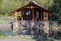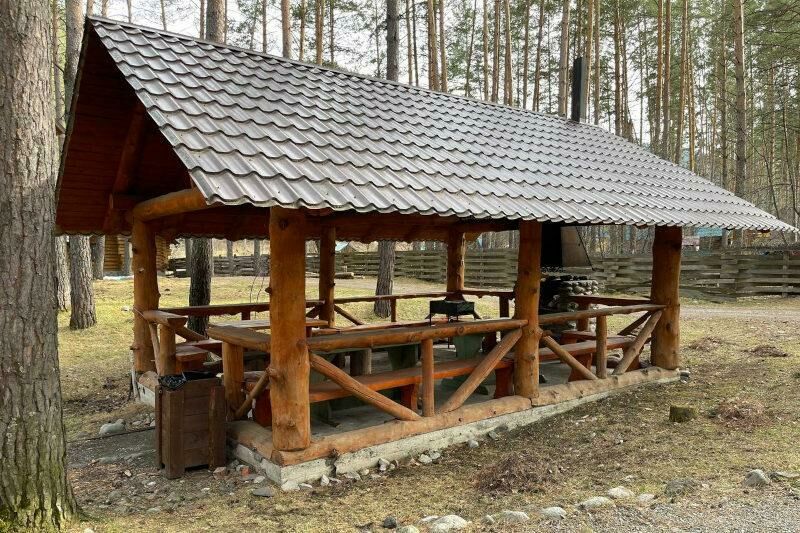 Беседка имеет уличный камин и мангал, два стола и скамейки по периметру. Там может разместиться компании до 10 человек.