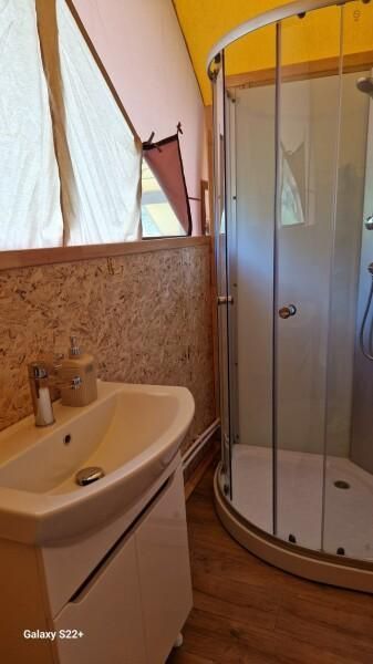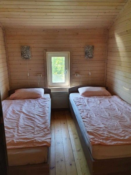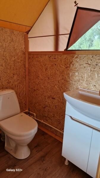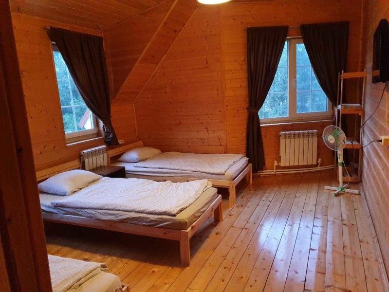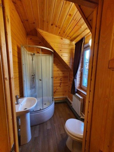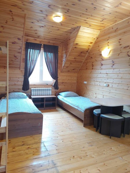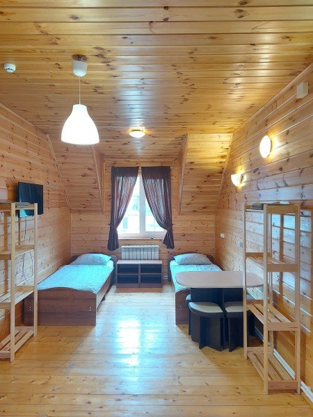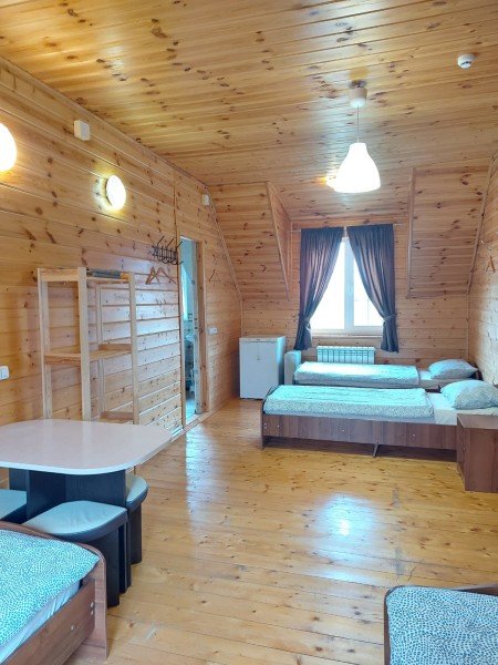 Оборудован всеми удобствами: санузел с душевой, кондиционер и обогреватели. Есть собственная кухня с микроволновкой, индукционной плиткой, электрическим чайником, посудой. Имеется собственный мангал.