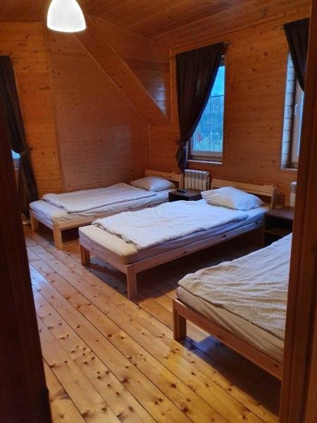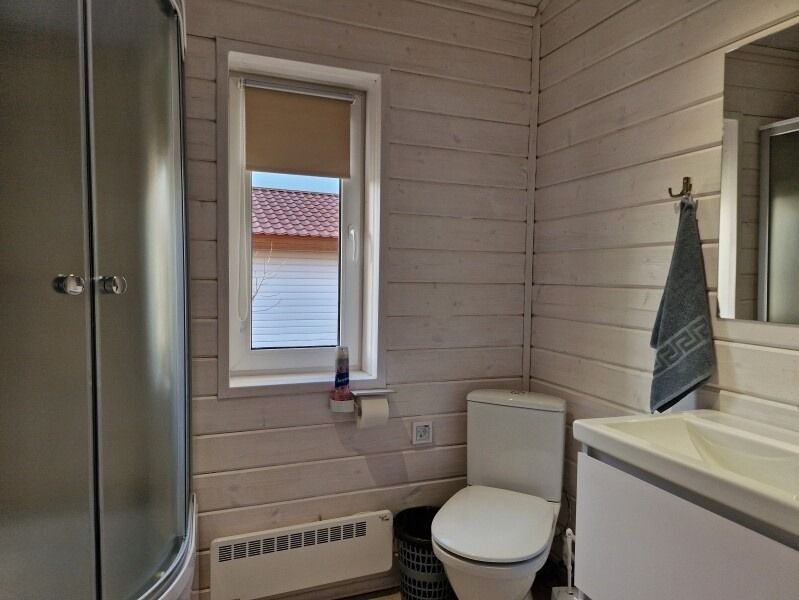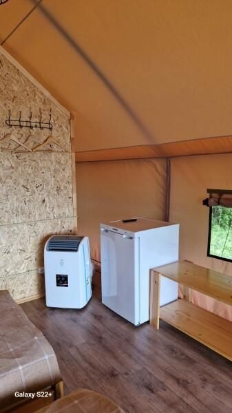 Оборудован всеми удобствами: санузел с душевой, кондиционер и обогреватели. Есть собственная кухня, оборудованная микроволновой печью, индукционной плиткой, электрическим чайником и посудой. Также имеется мангал.