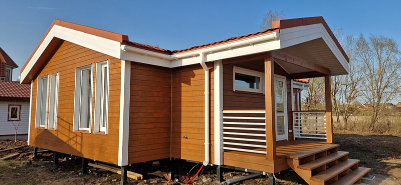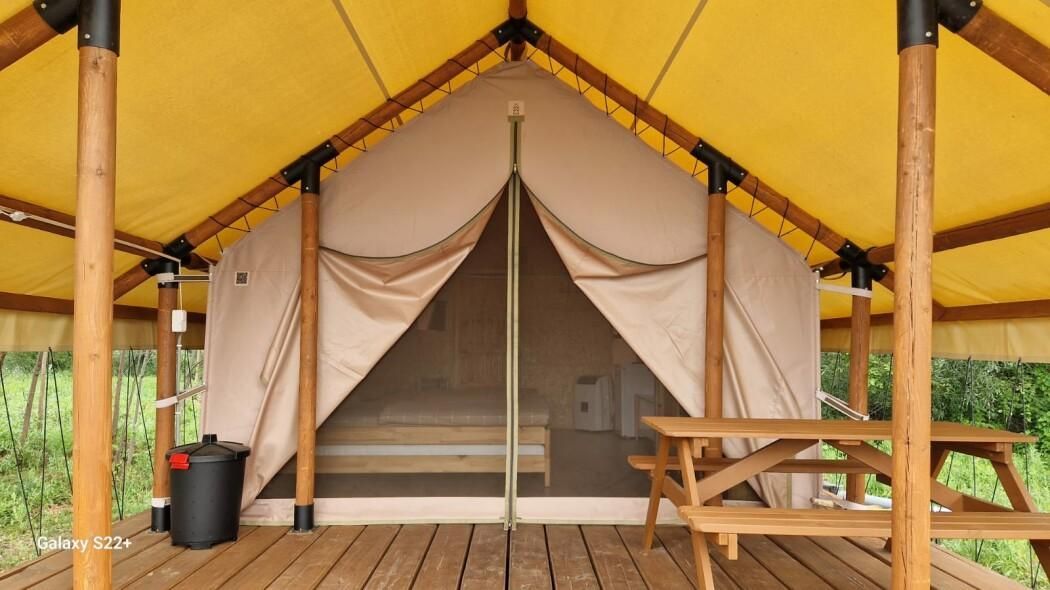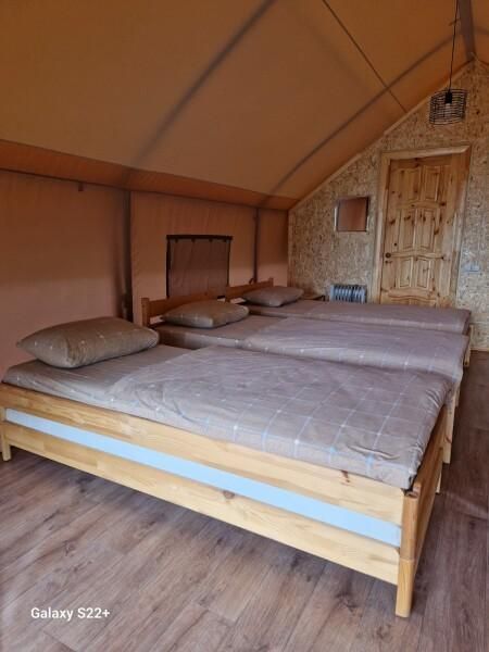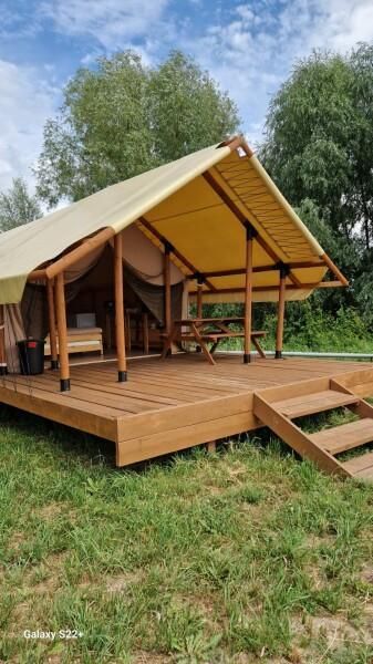 Площадь внутри составляет двадцать четыре квадратных метра, а терраса с навесом — шестнадцать квадратных метров. Кровати можно скомплектовать в двух- или трехместном исполнении. Постельное белье и полотенца входят в комплект.