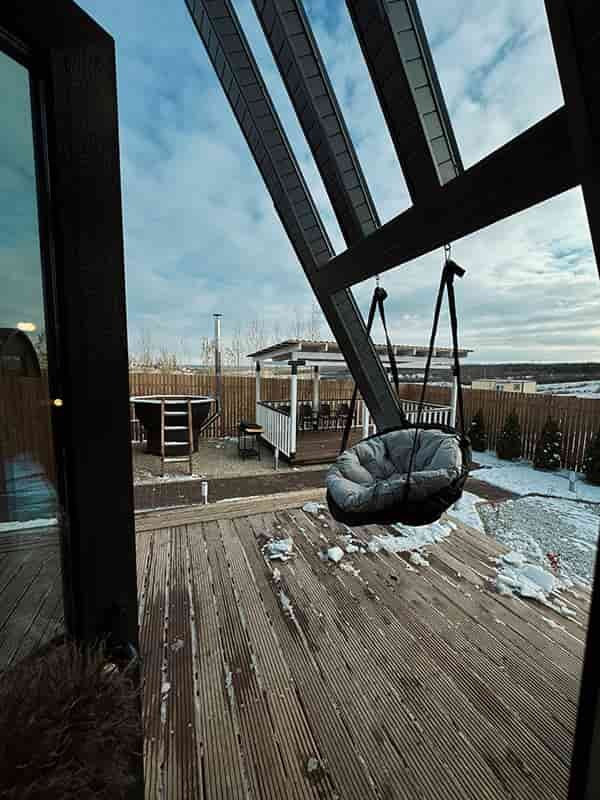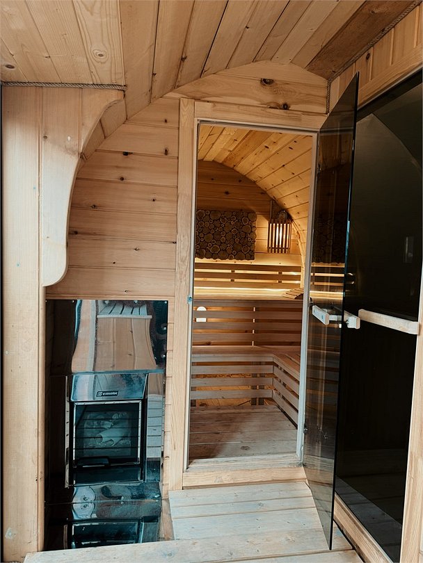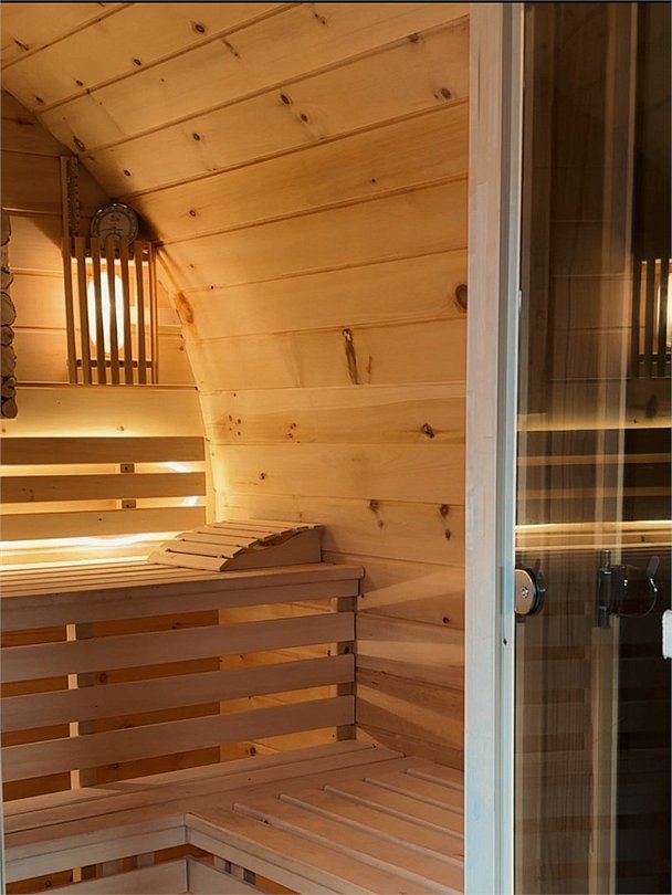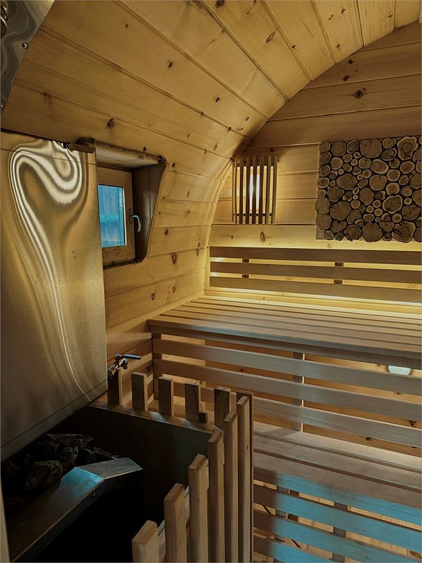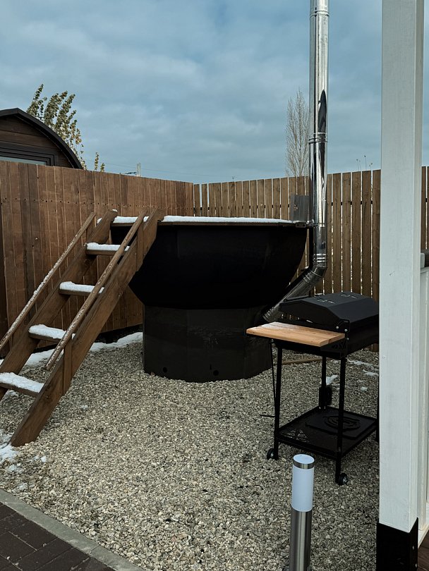 Для истинных ценителей релаксации есть уединенная баня на дровах и банный чан с подогревом — высокий забор гарантирует полное уединение, а хвойно-цитрусовая запарка превращает парение в настоящий спа-ритуал.