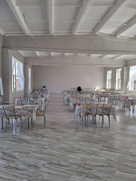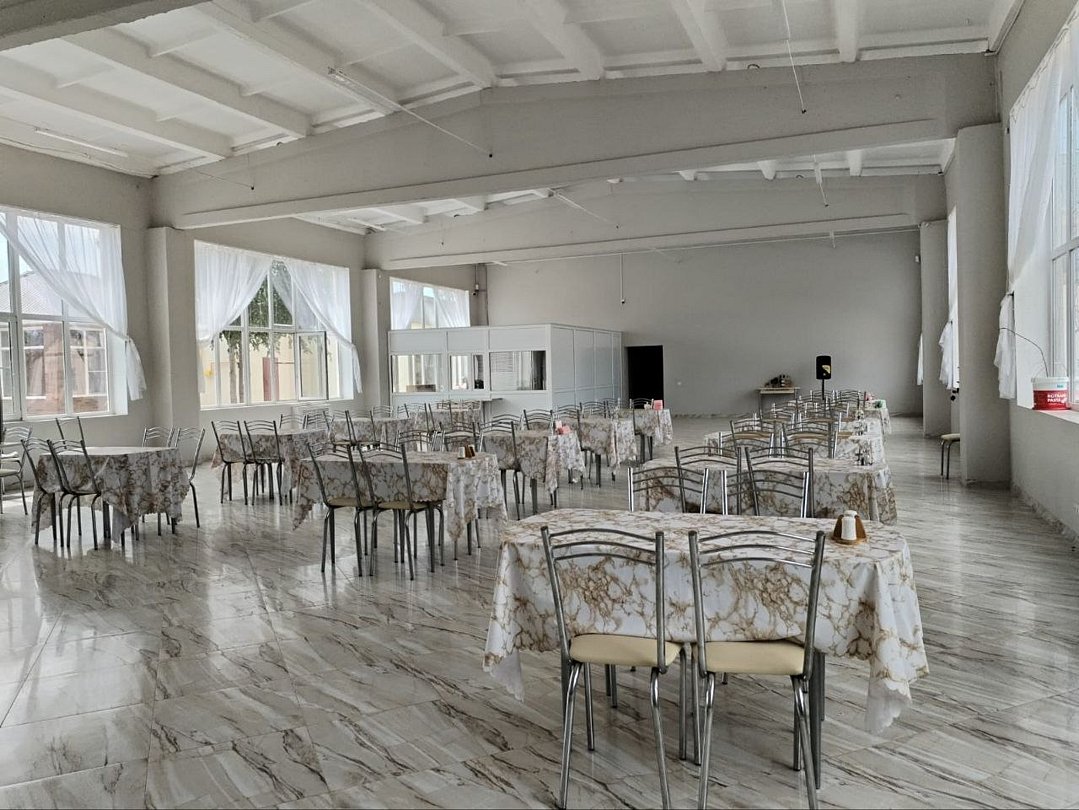Большой банкетный зал. Предоставляются горячие блюда, закуски, салаты. Меню обговаривается.