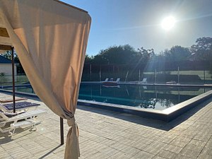 Просторный бассейн на открытом воздух с лежаками зонтиками и навесом. Бассейн с постепенным углублением, с одной стороны детская зона от 40 см и достигает 170 глубины в другой стороне.