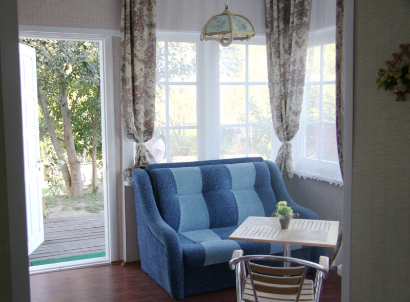 В доме имеется кухня со столовой зоной и телевизором. В номерах - туалет и раковина.