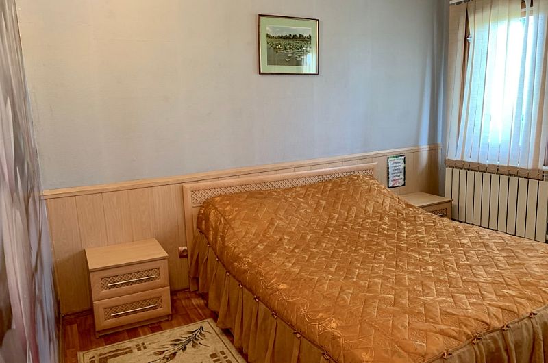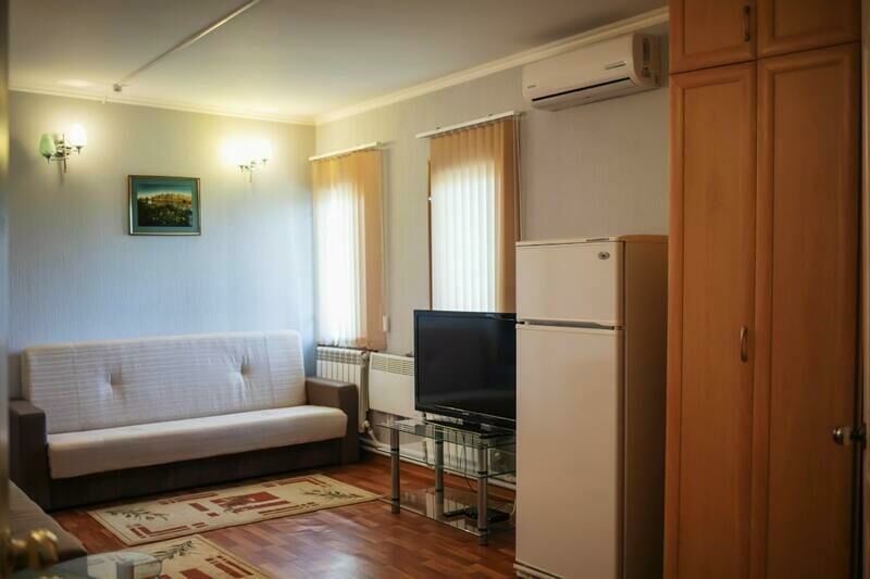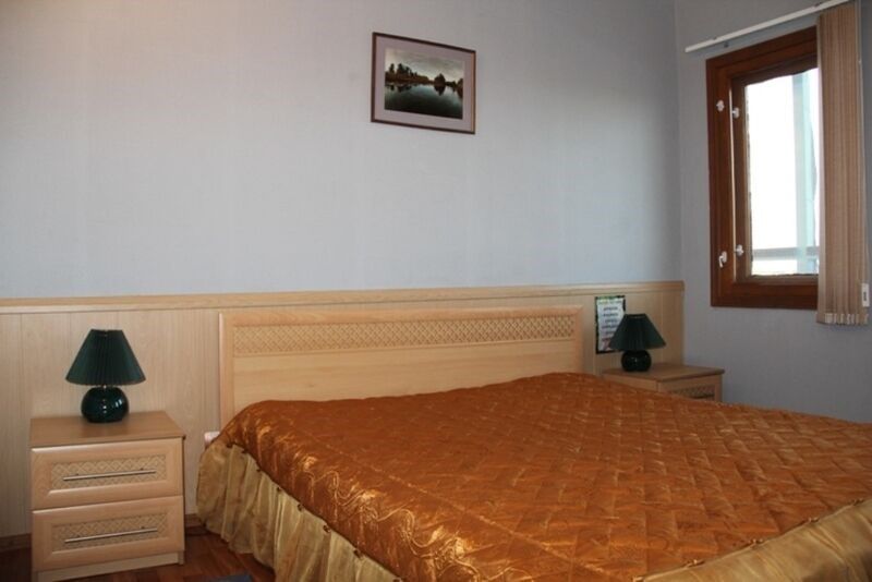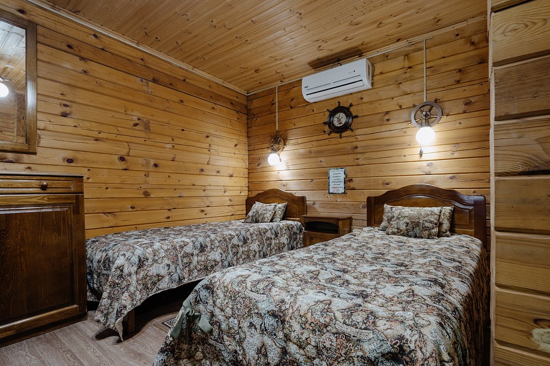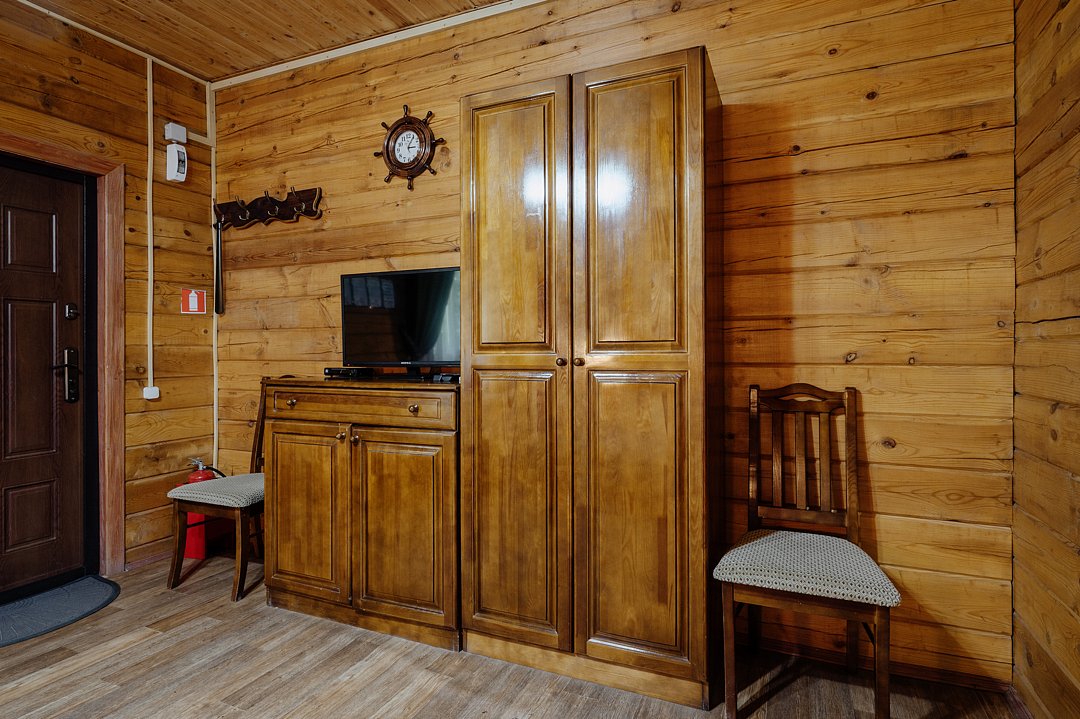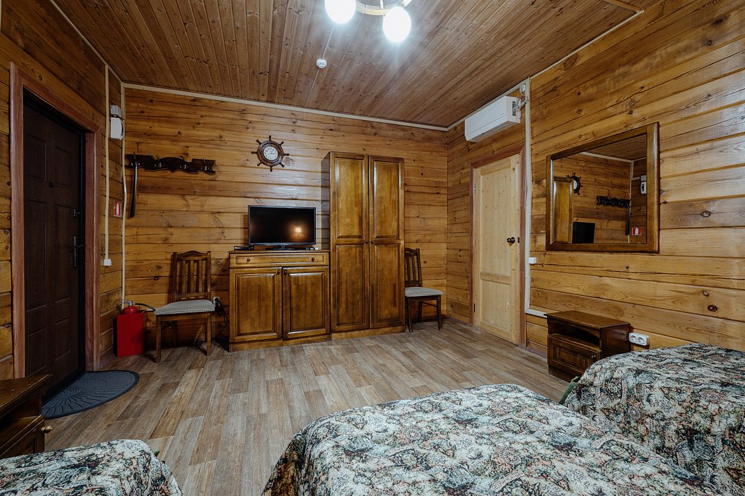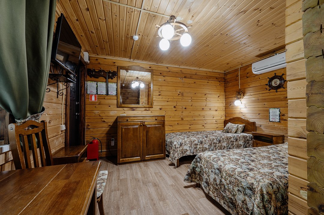 Оснащение номера: полутораспальные кровати, прикроватные тумбочки, комод и шкаф для одежды, обеденный стол и стулья, телевизор и холодильник, сплит-система.