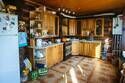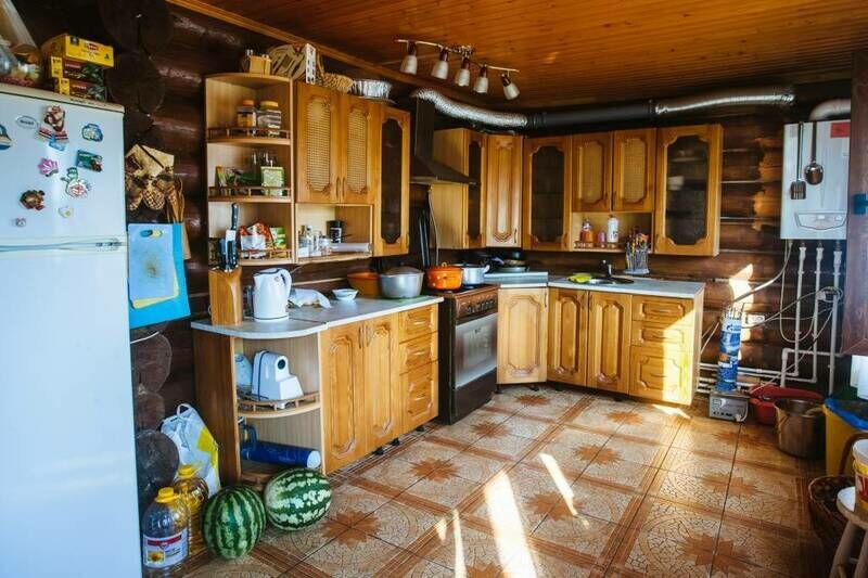 Кухня со всей кухонной техникой, морозильными камерами и посудой.