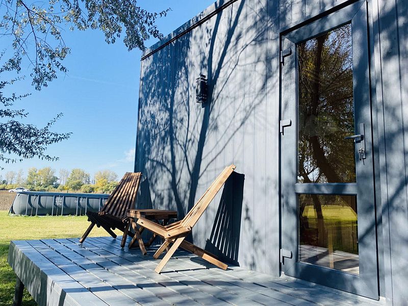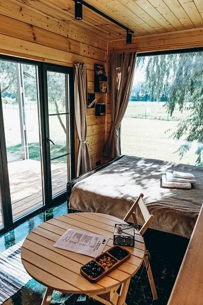 Предполагает двухместное размещение. Большая двуспальная кровать и панорамное окно во всю стену. Дом c собственной крытой террасой и грилем-барбекю. Мини кухня с необходимым набором посуды, ванная комната с душем.