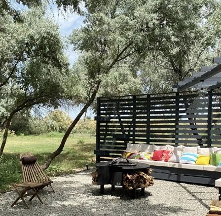 Для вас большая освещенная беседка с мягкими подушками и костровая чаша для гриля или казана.