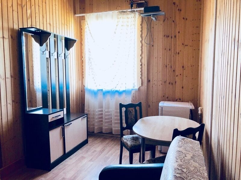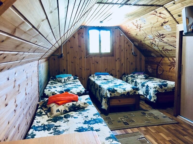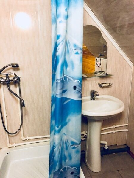 Номер на первом этаже с ванной комнатой (туалет, раковина, пластиковая душевая кабина), на мансарде второй двухместный номер с туалетом и раковиной, лестничный марш на мансардный этаж на общей веранде.