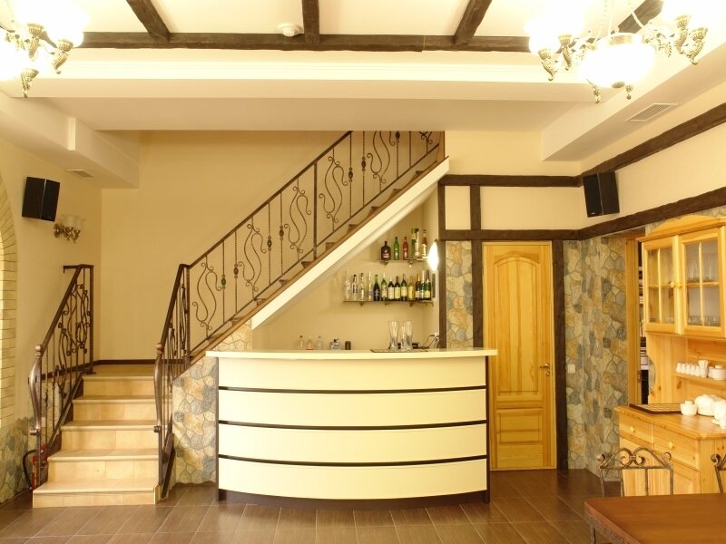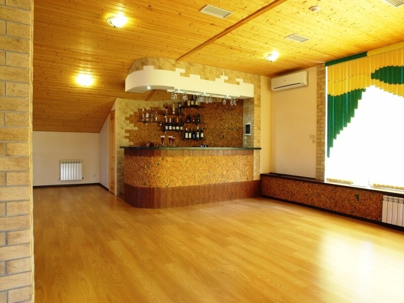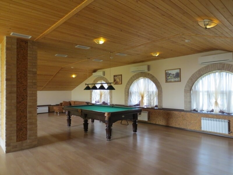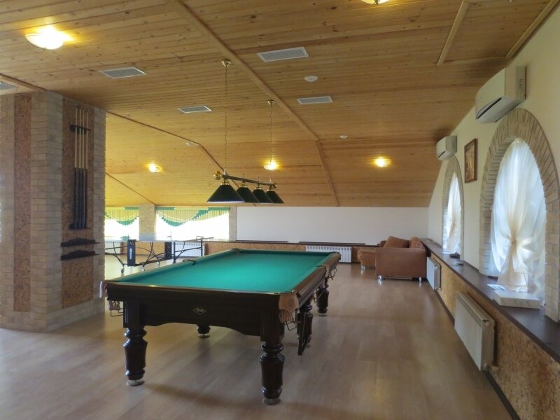 Окна ресторана с одной стороны выходят на реку, с другой — на базу отдыха. На втором этаже располагается бар с зоной отдыха, бильярдным столом, караоке, современным стерео оборудованием.
