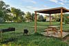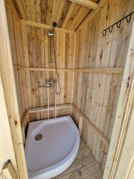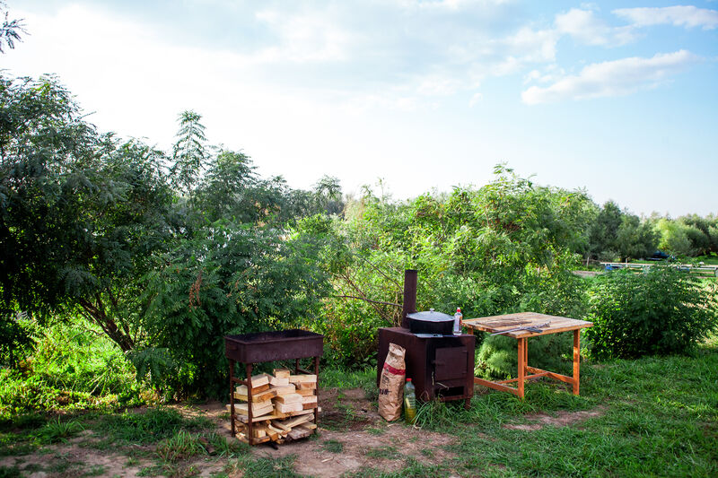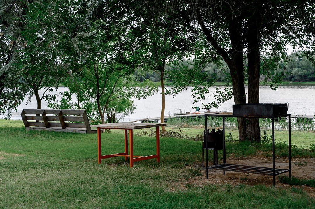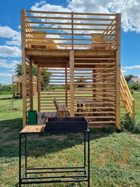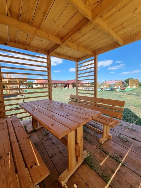 Каждый кемп-домик оснащен мангалом, столиком с лавочками, светильниками и розетками, антимоскитными сетками, полочками, в базовой комплектации имеет 2 матраца и 2 подушки.