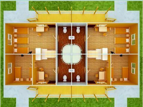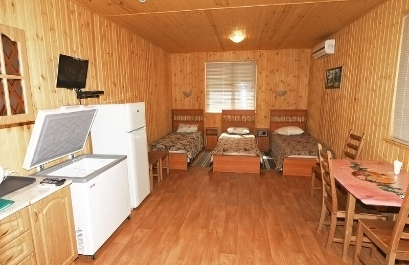 Номера на 2-х и 3-х человек имеют полезную площадь 12 и 16 м.кв., крытую веранду, отдельный санузел, горячая и холодная вода, автономный водонагреватель, кровати, прихожая, комод, вешалка, унитаз, на каждом окне жалюзи, общая веранда, холодильник, морозильный ларь (на веранде рядом с номером), ТВ+"триколор".