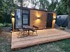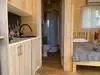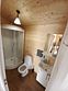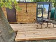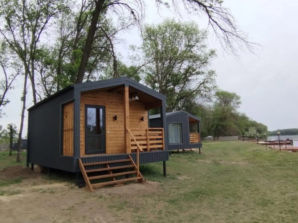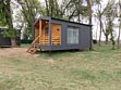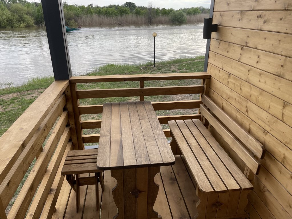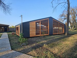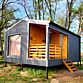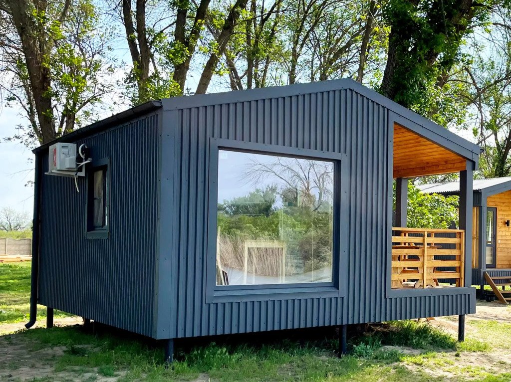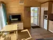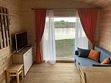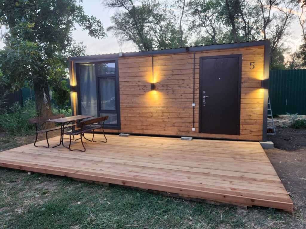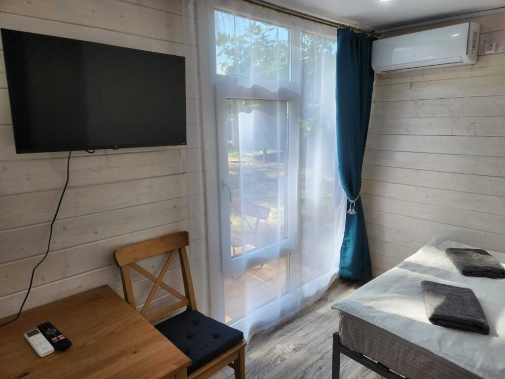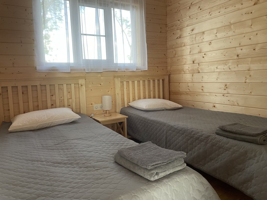 Есть большое окно, две кровати, душевая, санитарный узел. Можно добавить по желанию еще одно спальное место. Находится в лесной зоне, в тени. У домика есть своя терраса где можно вечером провести время.
