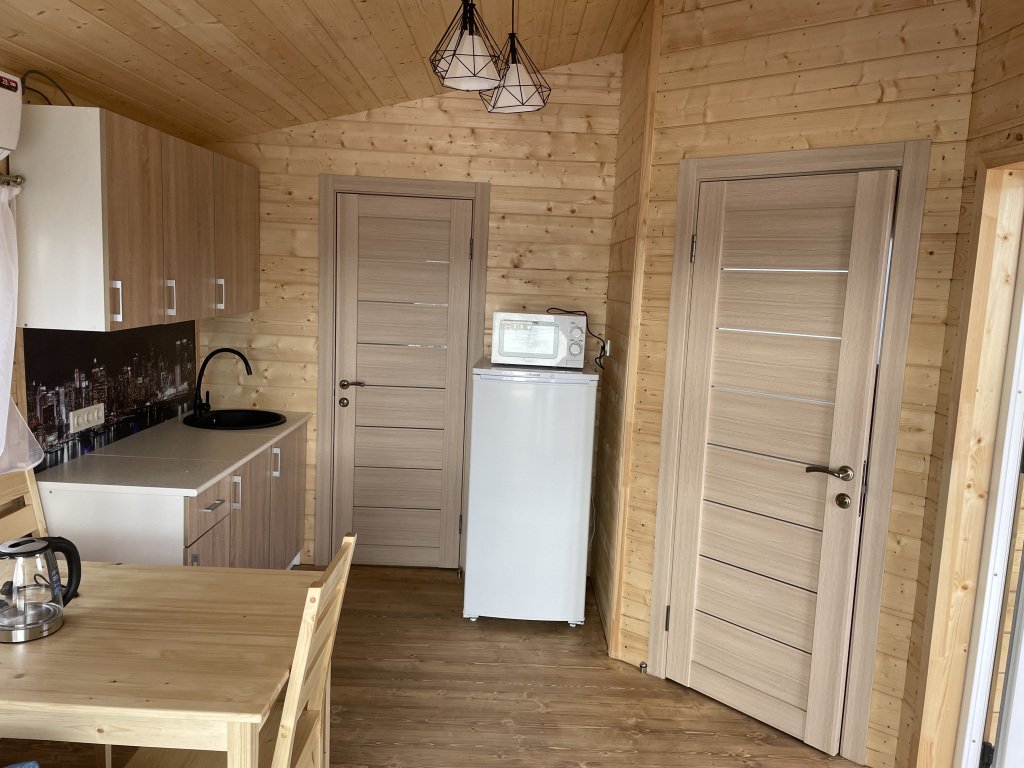 В домиках есть кухни, оборудованные холодильником, микроволновой печью, чайником и набором посуды. Помимо этого, за дополнительную плату на базе можно заказать вкусное трехразовое питание.