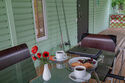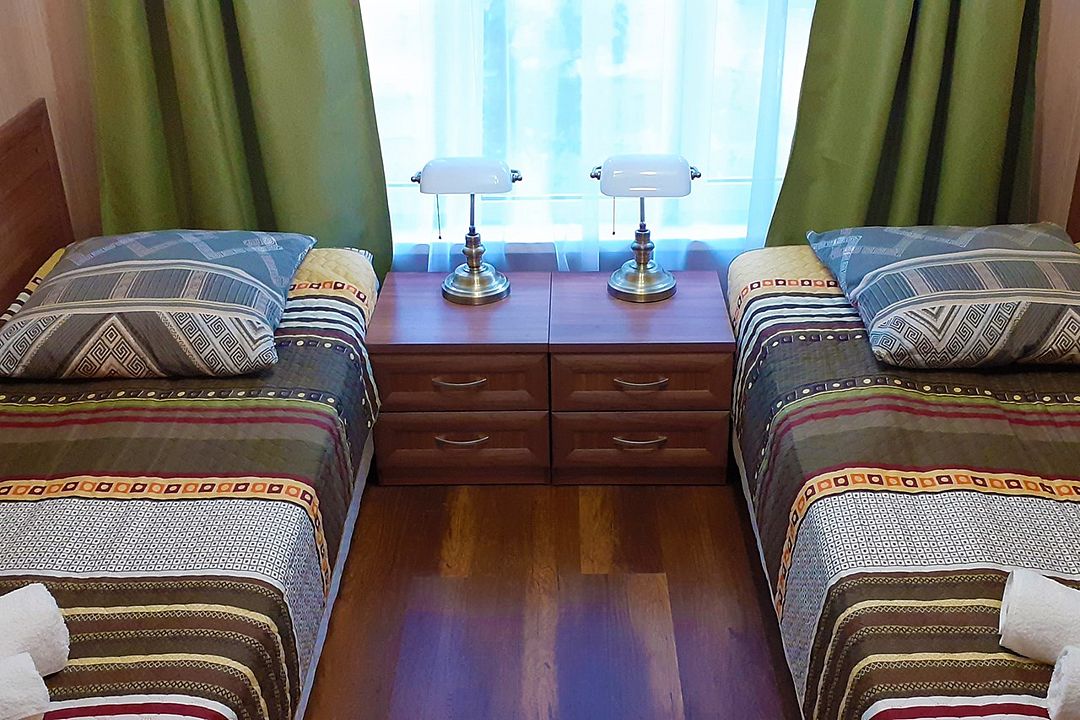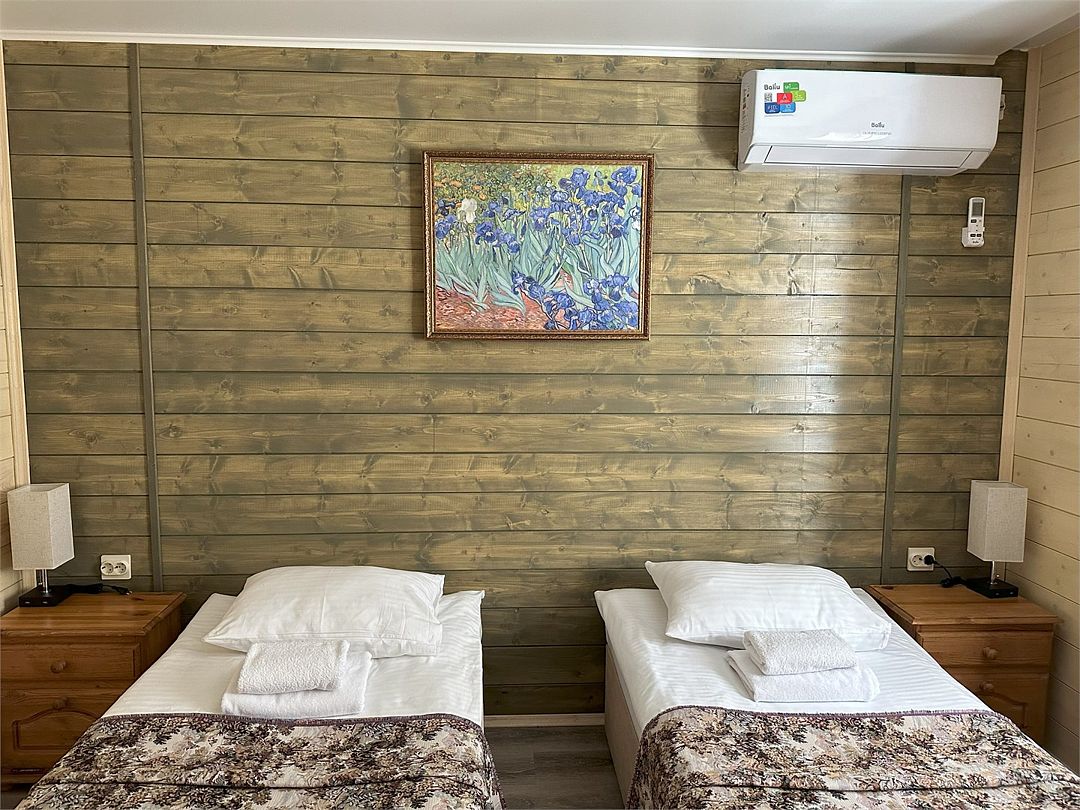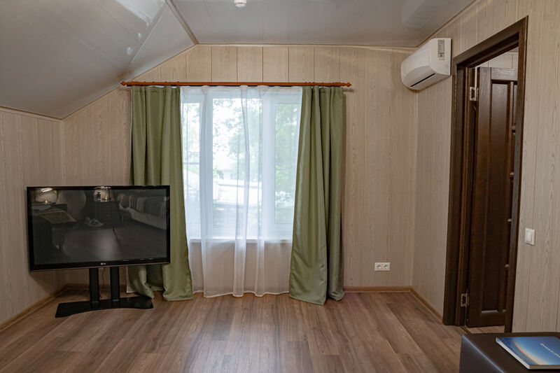 Студия (60 кв м) – это просторная комната, прихожая, теплая веранда-гостиная, санузел. В комнате могут быть 2 раздельные или 1 двуспальная кровати на выбор гостей.