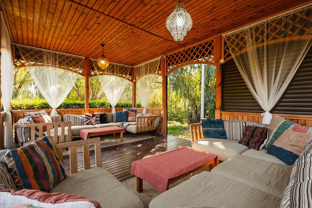 Аренда летней беседки на берегу реки до 12 человек (для дневного пребывания), в том числе для проживающих на базе гостей — 6500 ₽ / день (с обслуживанием официантом).