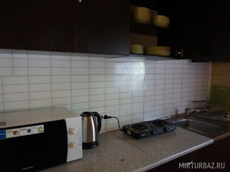 - оборудованная всем необходимым кухня-столовая (плита, холодильник, мультиварка, мойка, микроволновка, чайник, посуда, кухонные принадлежности);