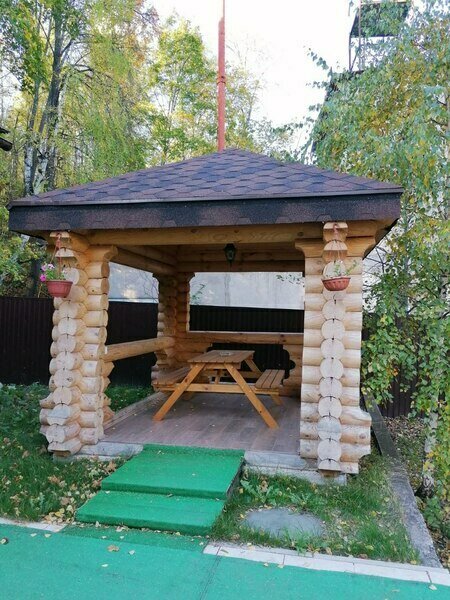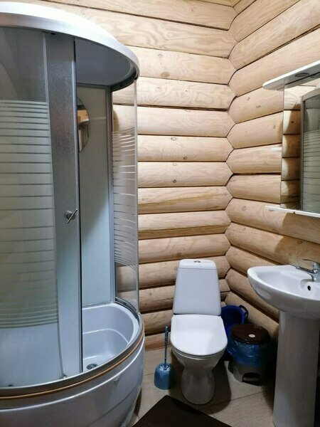 Деревянный уютный коттедж с беседкой на компанию до 10 человек: 2 спальни с двухместными кроватями, 2 спальни с 2мя одноместными кроватями, санузел и телевизор в каждом номере индивидуальный. Душевая одна на 4 номера. Гостиная с двухместным диваном, камином, обеденным столом, холодильником, микроволновой печью, посудой, телевизором.
