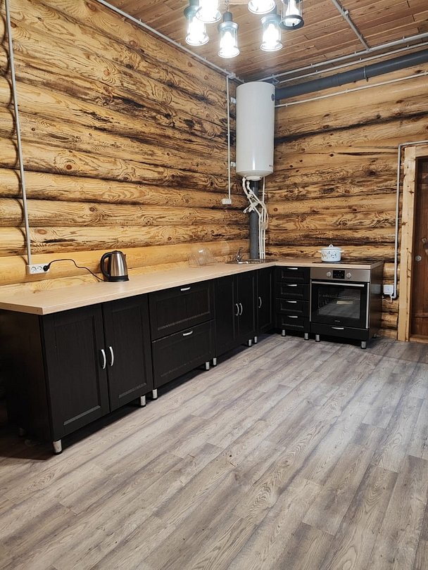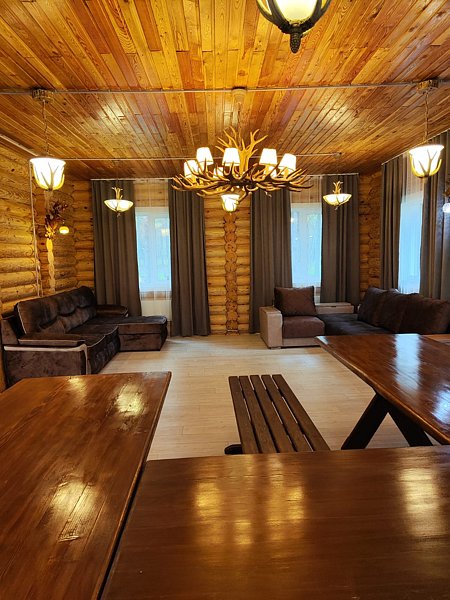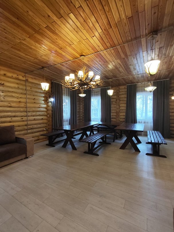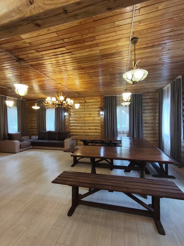Зал оснащен столами и лавками. Также имеется два угловых дивана. Также предоставляется кухня для приготовления пищи с варочной поверхностью и духовкой.