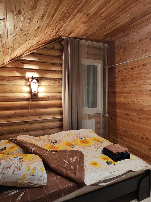 Номер находится на втором этаже двухэтажного дома, в номере кровать на 160х200, комфортный раскладной диван и кровать 90х200. Тумба, чайник, посуда, столовые приборы.