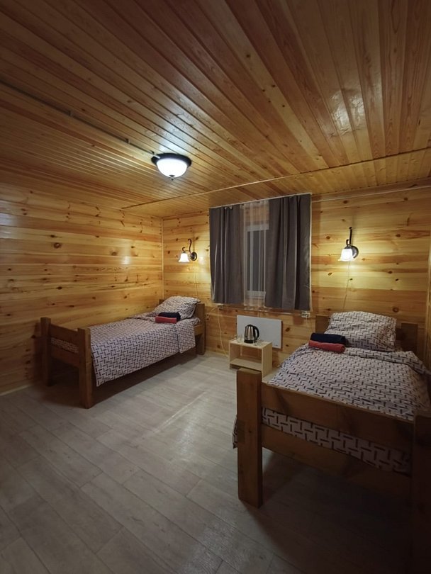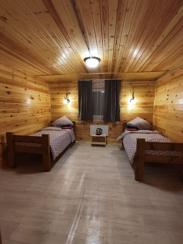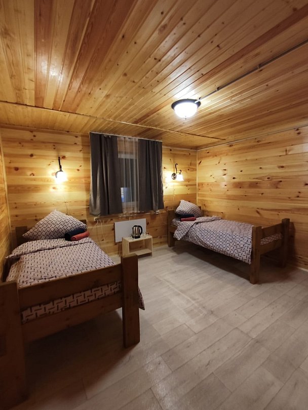 Двухместный номер с двумя раздельными кроватями 90х200. В доме 4 номера. Оснащение: чайник, вешалка, чайная пара, столовые приборы.