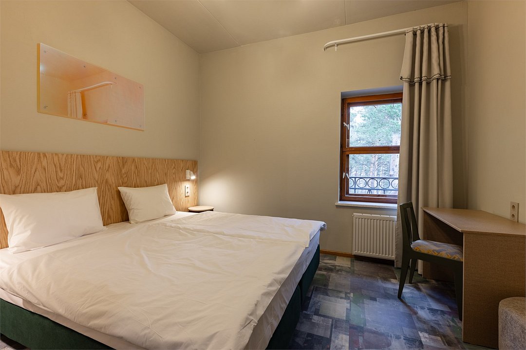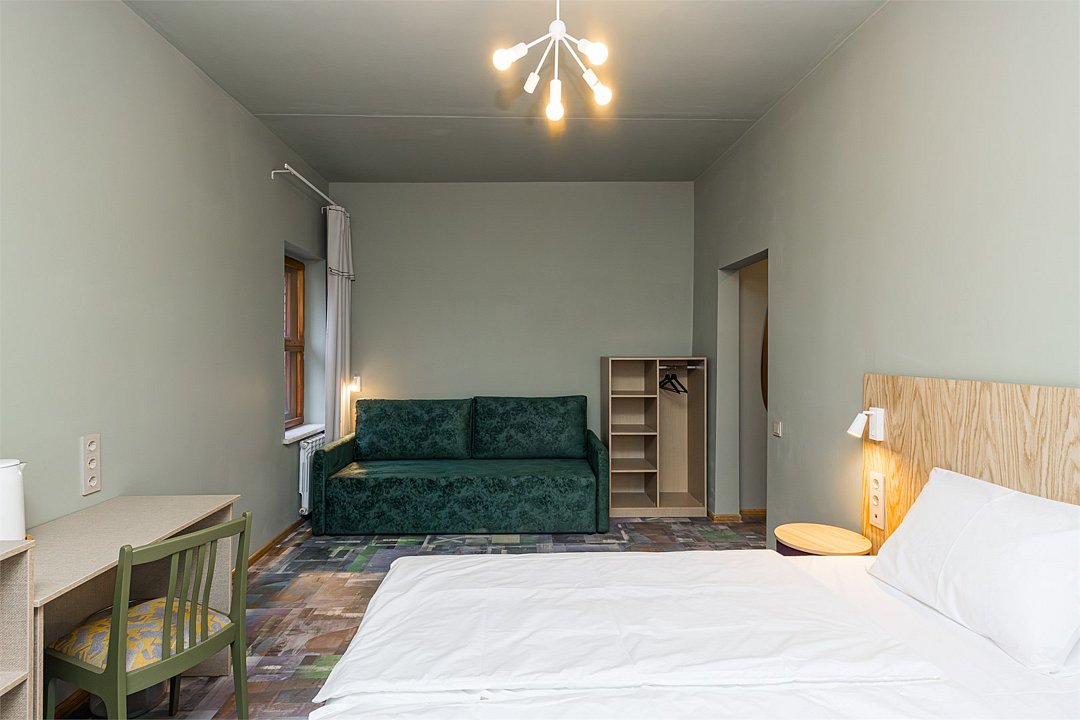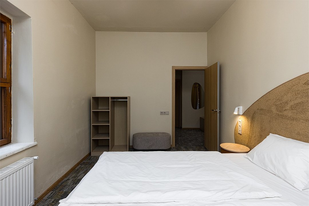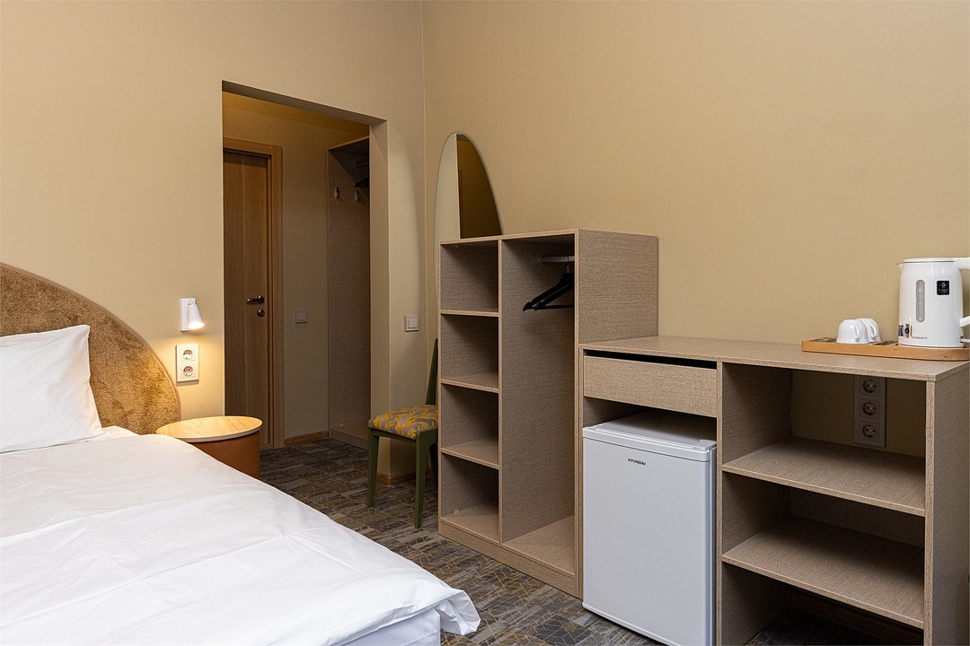Совершенно новый дизайнерский однокомнатный номер в нашем главном корпусе, прошедшем полную реконструкцию. Большая прихожая и спальная комната, в которой есть все необходимое для комфортного отдыха: Роскошная двуспальная кровать, двуспальный раскладной диван, письменный стол, холодильник, чайная станция, телевизор и интернет. Просторная туалетная комната с выделенной душевой зоной. Полотенца, тапочки, профессиональная косметика - все для вашего лучшего отдыха.Услуги и удобства