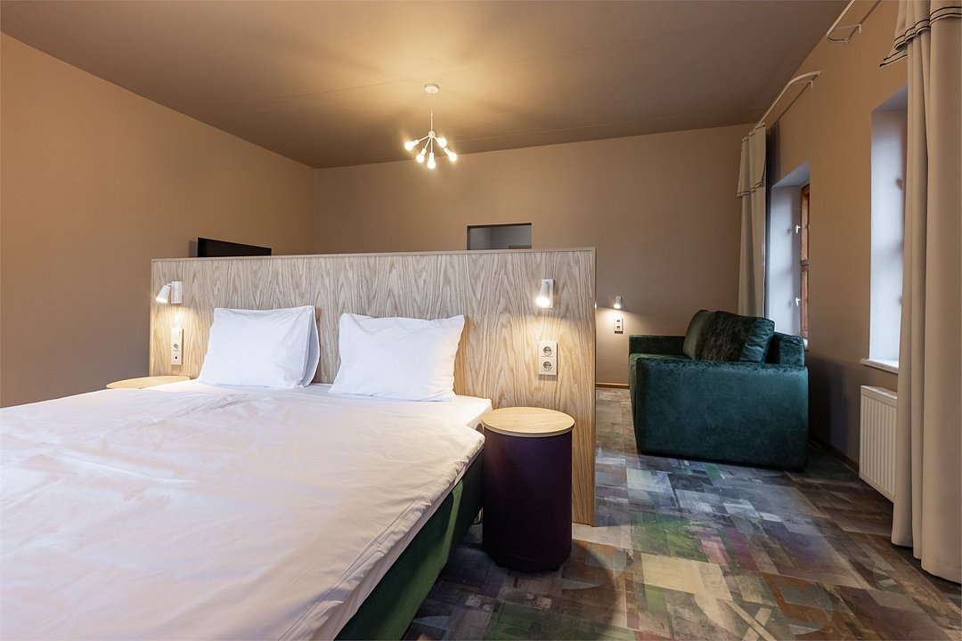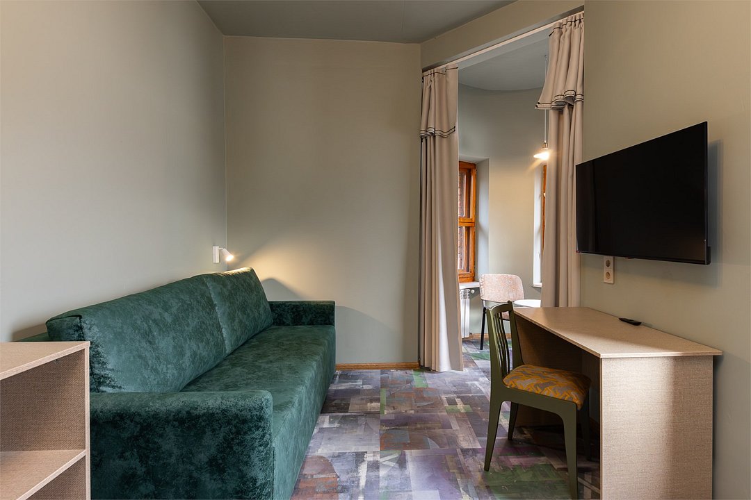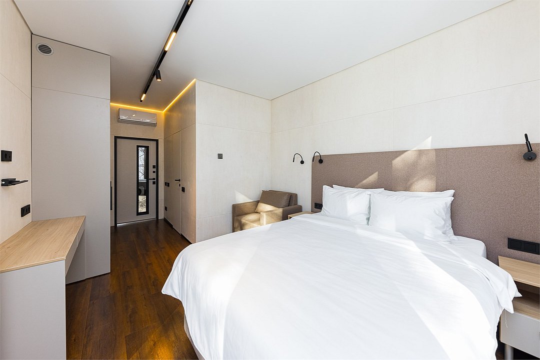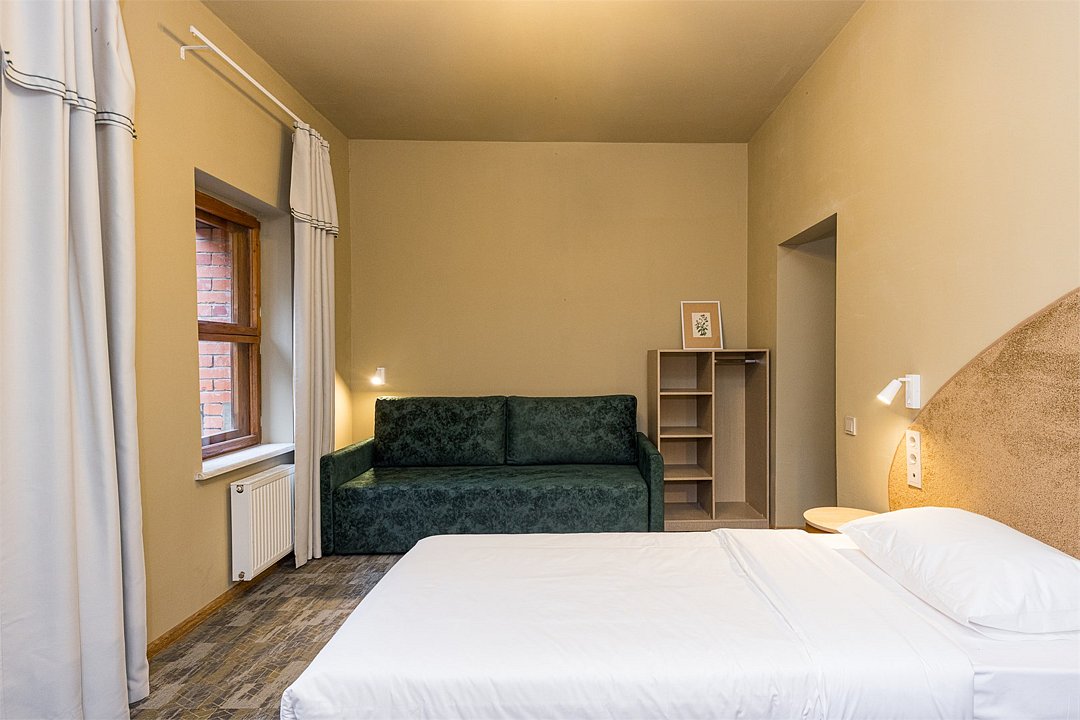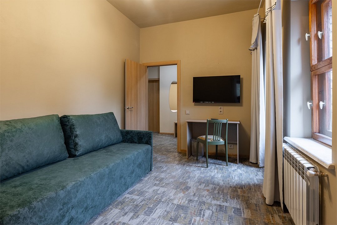 Совершенно новый дизайнерский однокомнатный номер в нашем главном корпусе, прошедшем полную реконструкцию. Большая прихожая и спальная комната, в которой есть все необходимое для комфортного отдыха: Роскошная двуспальная кровать, двуспальный раскладной диван, письменный стол, холодильник, чайная станция, телевизор и интернет. Просторная туалетная комната с выделенной душевой зоной. Полотенца, тапочки, профессиональная косметика - все для вашего лучшего отдыха.Услуги и удобства