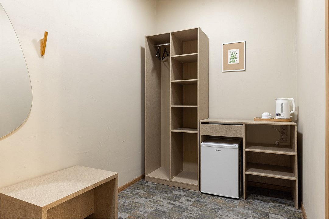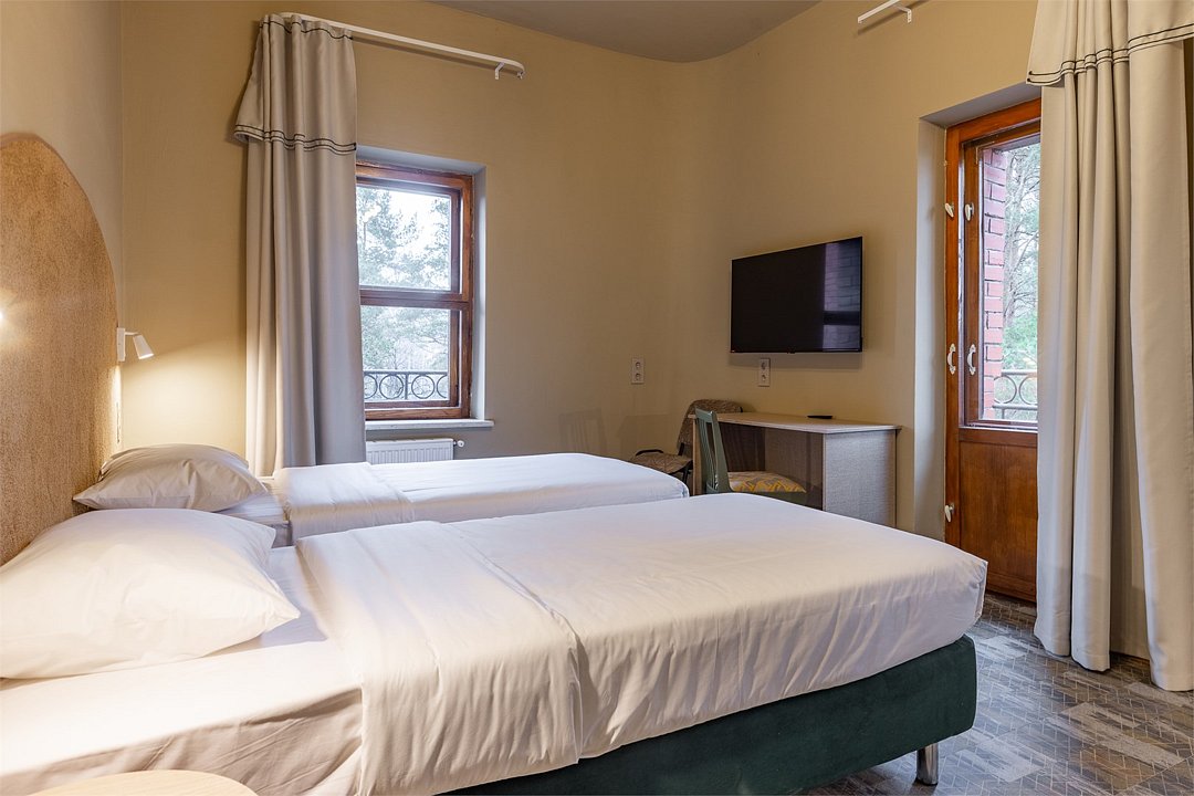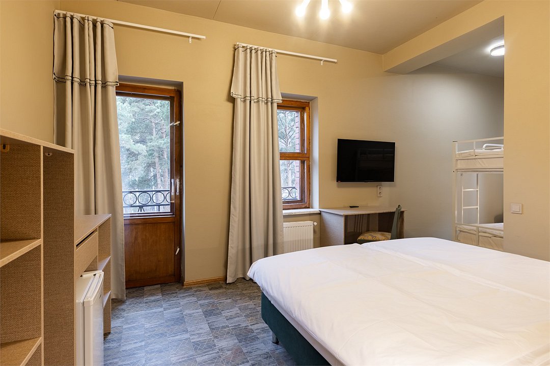 телевизор, интернет, холодильник, фен, банные полотенца, тапочки, косметические средства, двуспальная кровать, стулья, шкаф для одежды, багажная тумба, зеркало, питьевая вода, стол, внутренний телефон, номер для некурящих, вид на лес, двухъярусная кровать, чайная станция, набор для приготовления чая и кофе, вешалки-плечики, затемняющая штора, открытый шкаф, дождевой и ручной душВ номере