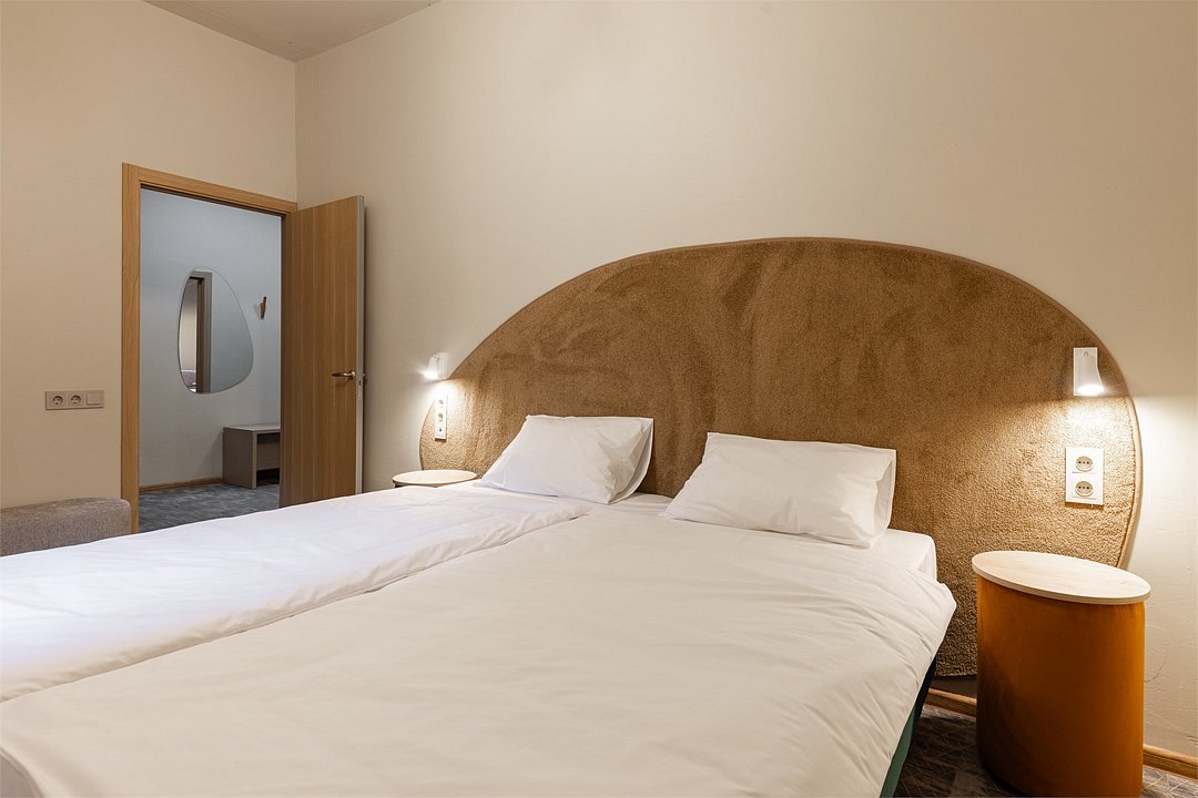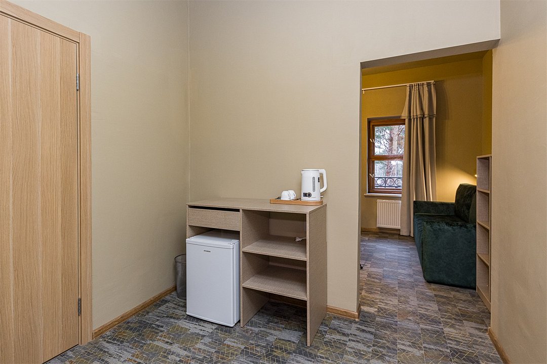 Совершенно новый дизайнерский двухкомнтаный номер в главном корпусе, прошедшем полную реконструкцию. Большая прихожая, гостиная и спальная комната, в которых есть все необходимое для вашего комфортного отдыха: Спальня с роскошной двуспальной кроватью, двуспальный раскладной диван, письменный стол, холодильник, чайная станция, телевизор в гостиной. Интернет везде. Раздельный санузел с просторной туалетной комнатой и отдельной душевой зоной для большего удобства. Полотенца, тапочки, профессиональная косметика - все для вашего лучшего отдыха.Услуги и удобства