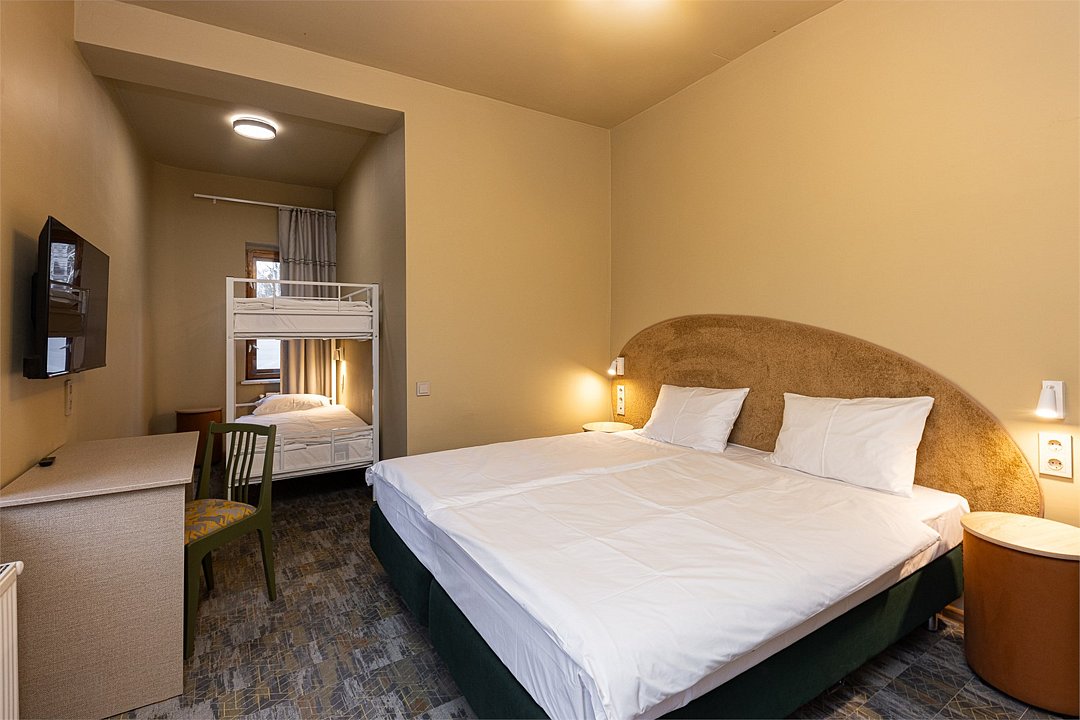 Совершенно новый дизайнерский двухкомнтаный номер в главном корпусе, прошедшем полную реконструкцию. Большая прихожая, гостиная и спальная комната, в которых есть все необходимое для вашего комфортного отдыха: Отдельная спальня с роскошной двуспальной кроватью, двуспальный раскладной диван, письменный стол, холодильник, чайная станция, телевизор в гостиной. Интернет везде. Двухъярусная кровать с ортопедическими матрасами на радость детям и их родителям. Раздельный санузел с просторной туалетной комнатой и отдельной душевой зоной для большего удобства. Полотенца, тапочки, профессиональная косметика - все для вашего лучшего отдыха.Услуги и удобства