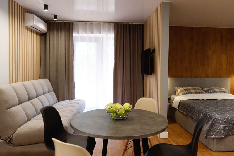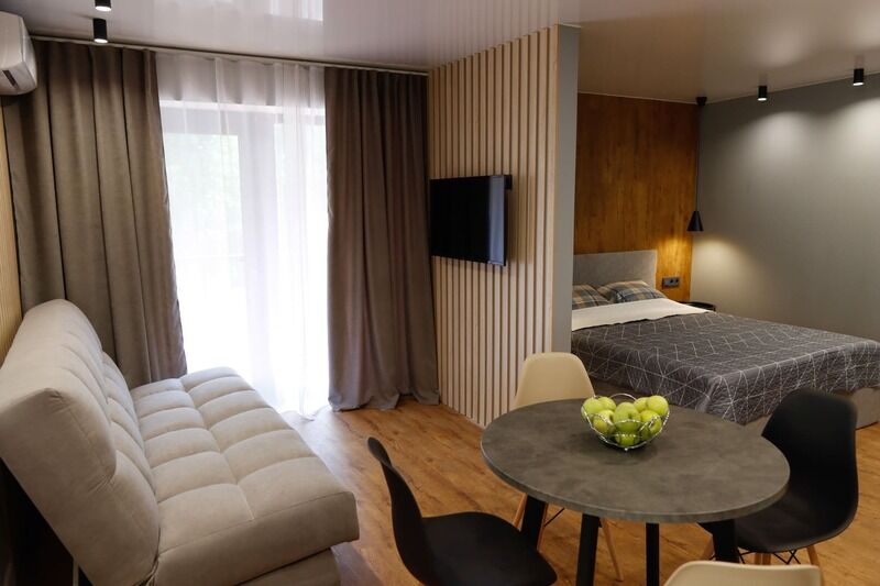 В номере есть: ванная комната с душем и туалетом, диван кровать в гостиной, одна большая кровать , постельное белье, полотенца, телевизор, кондиционер, кухня с варочной поверхностью, вся необходимая посуда и приборы для приготовления пищи.