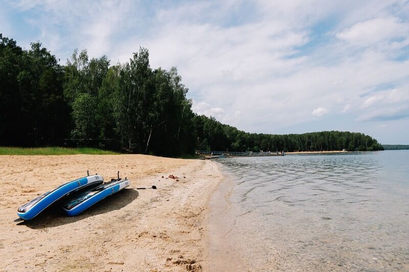 До озера всего 100 метров. Там находится благоустроенный песчаный пляж с мелким желтым песком и кабинка для переодевания.