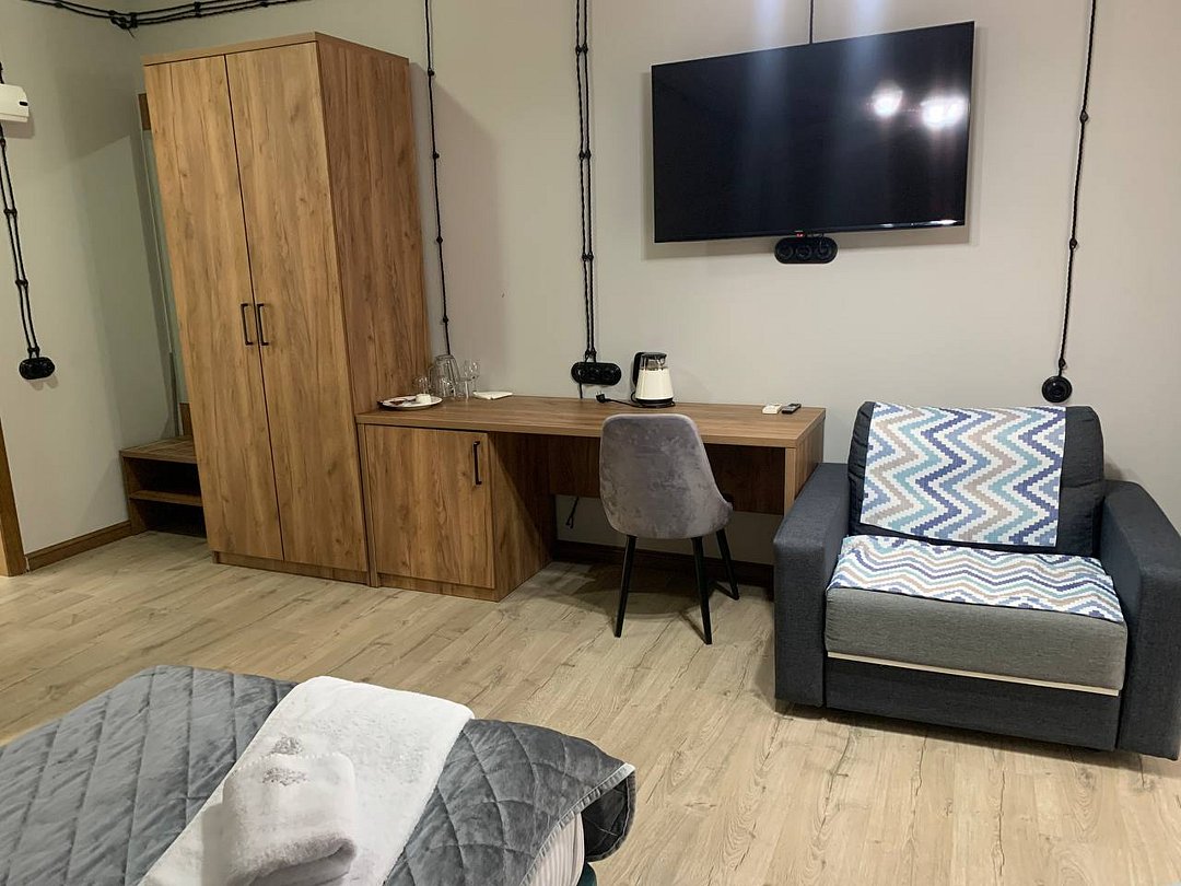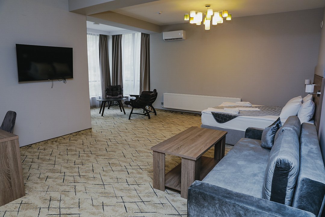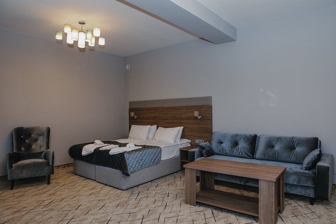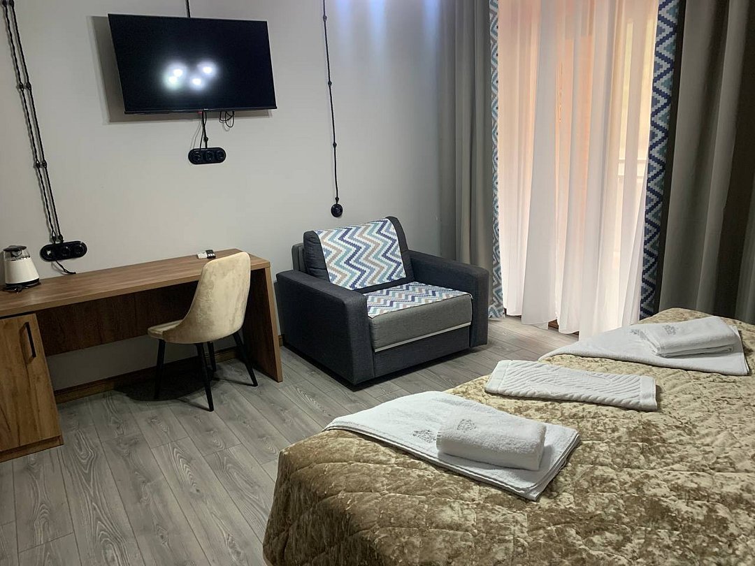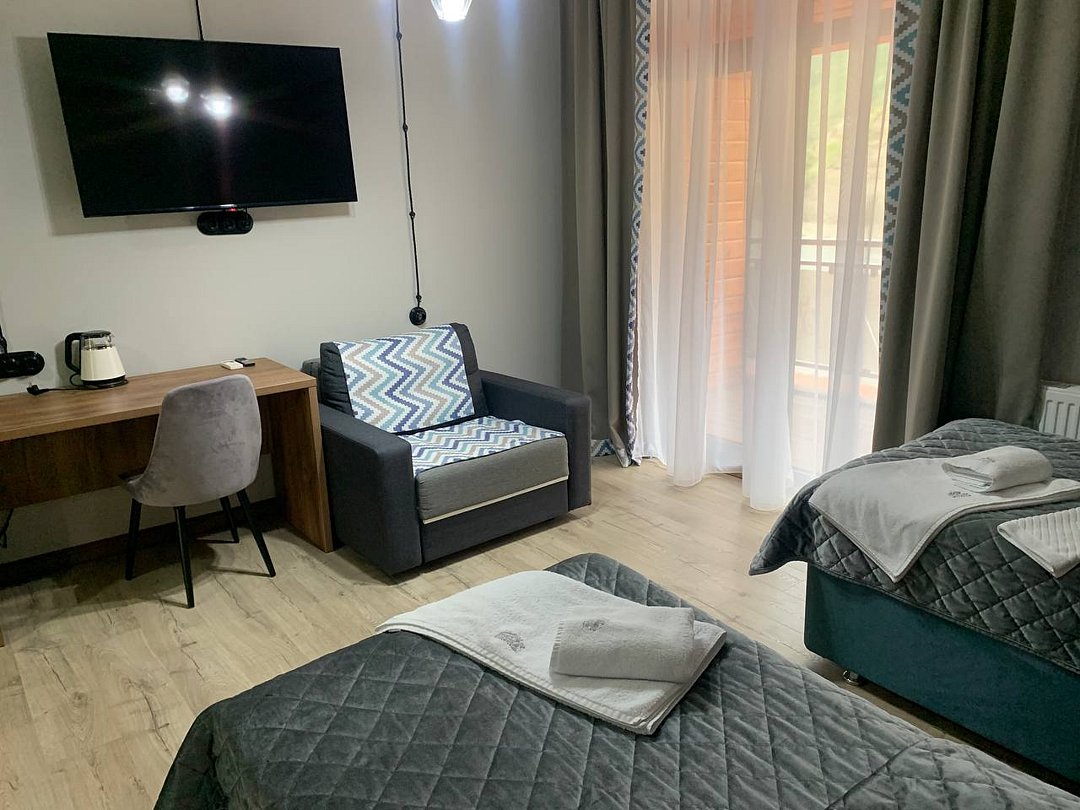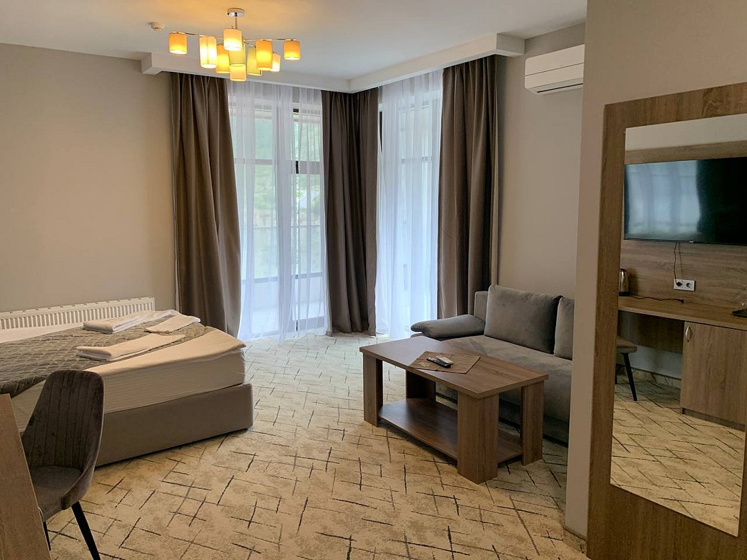 Комфортный однокомнатный номер с двуспальной кроватью, двухместным раскладным диваном и балконом.