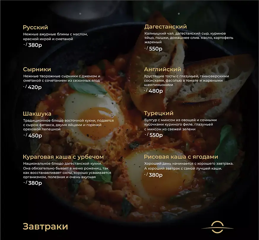 Тип меню: русская кухняВремя работы: от 08:00 до 22:00Ресторан горного отеля уютно расположился у реки, предлагая восхитительные виды и мягкое звучание горной воды. Здесь можно насладиться завтраками, обедами и ужинами, выбрав из разнообразного меню, включающего стейки, шашлыки, пасту, пиццы, салаты, десерты и аутентичные дагестанские блюда, такие как чуду, хинкал и курзе.