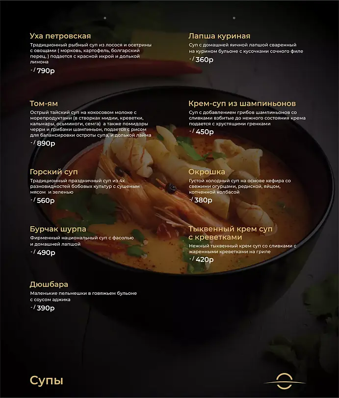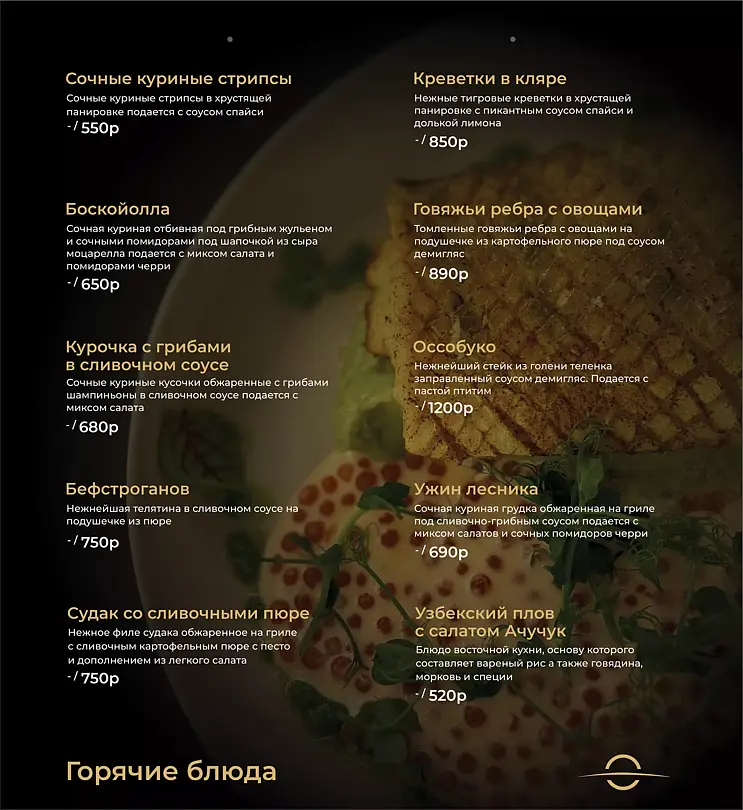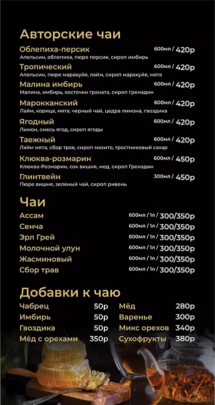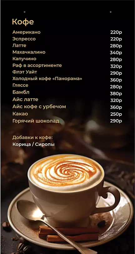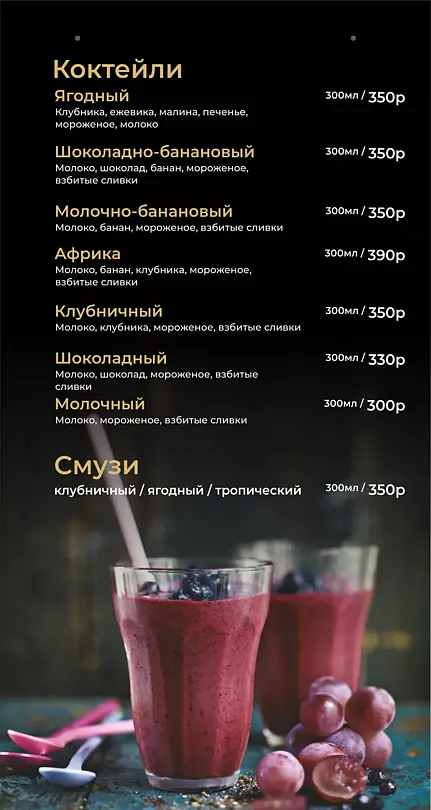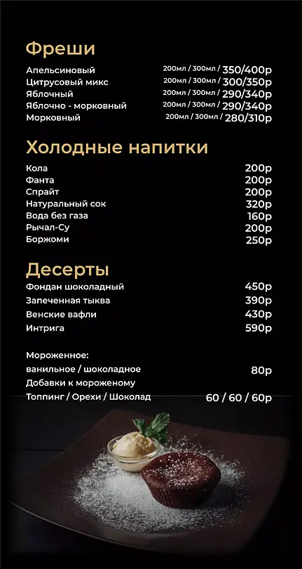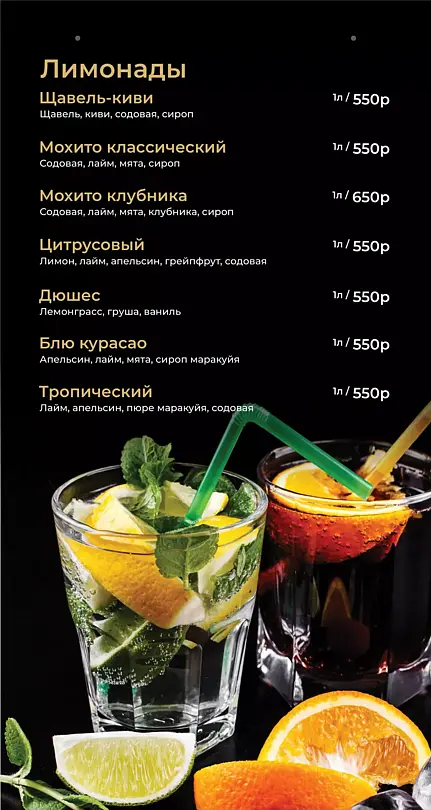 Завершить трапезу можно, наслаждаясь широким выбором напитков: освежающими фрешами, бодрящими коктейлями, лимонадами, нежными смузи, ароматными чаями и изысканным кофе.