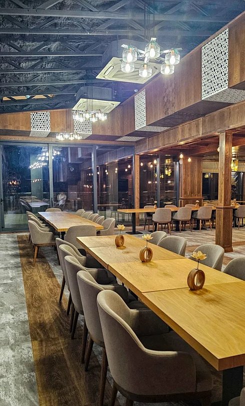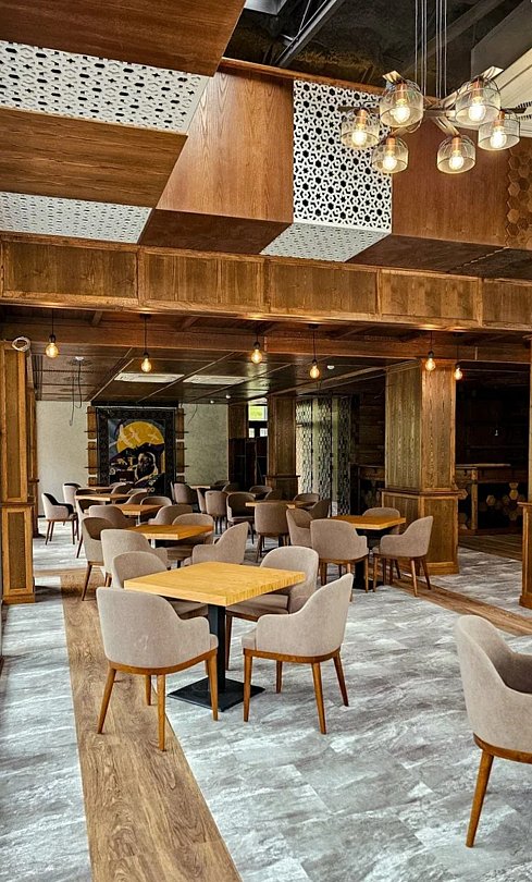 Для гурманов в отеле есть два ресторана, где можно насладиться как национальными, так и европейскими блюдами. Особое внимание стоит уделить рыбным деликатесам: в искусственном водоеме отеля обитают форель и осетр, которых поймают и приготовят специально для вас. Ресторан на берегу реки и панорамный ресторан на четвертом этаже предложат вам незабываемые кулинарные впечатления.