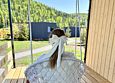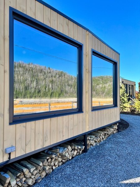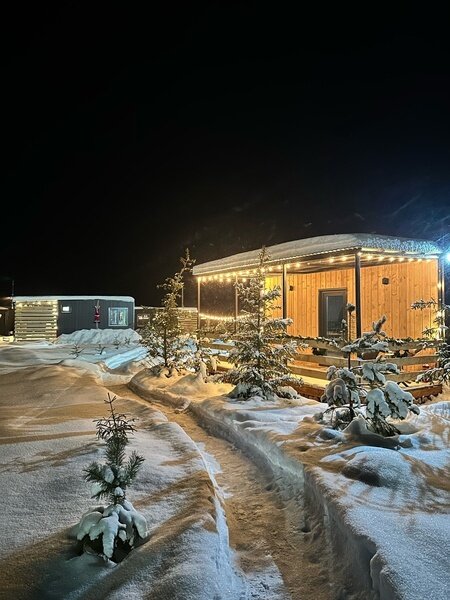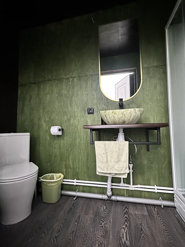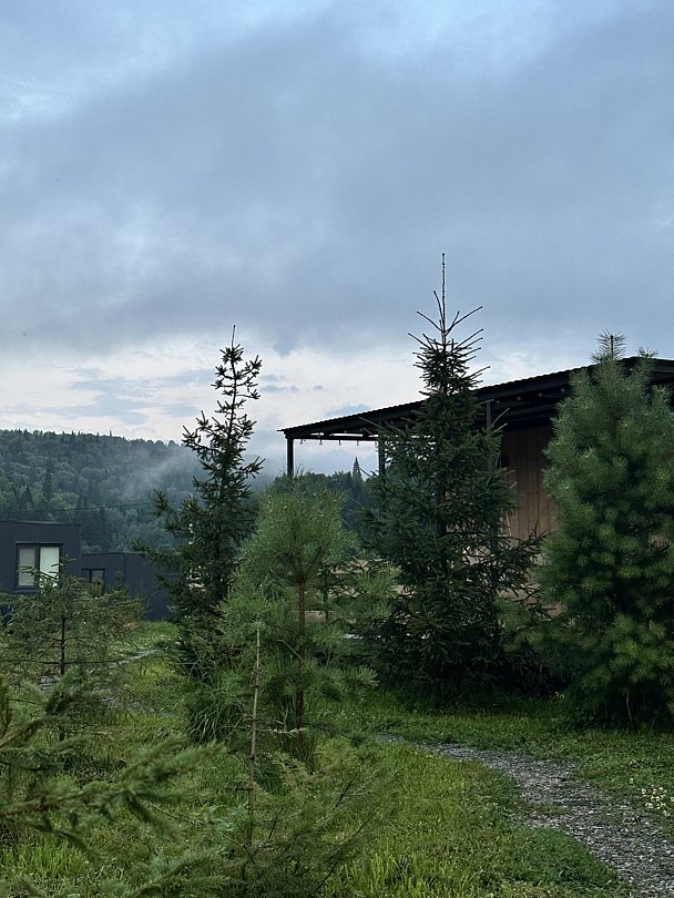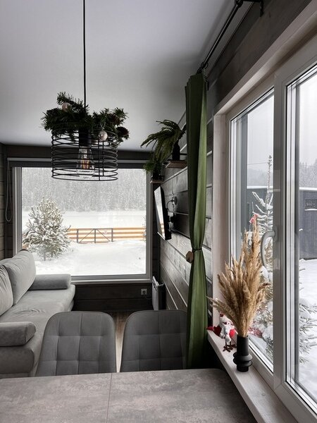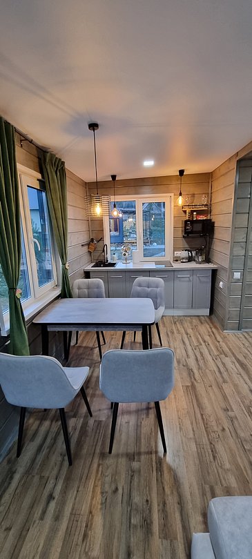 В доме есть кухонная зона с плитой, холодильником, микроволновой печью, чайником и всей необходимой посудой; двуспальная кровать, обеденная зона, санузел с душем, терраса с уличной мебелью, собственная мангальная зона. Из дома открывается шикарный вид на территорию и лес.
