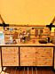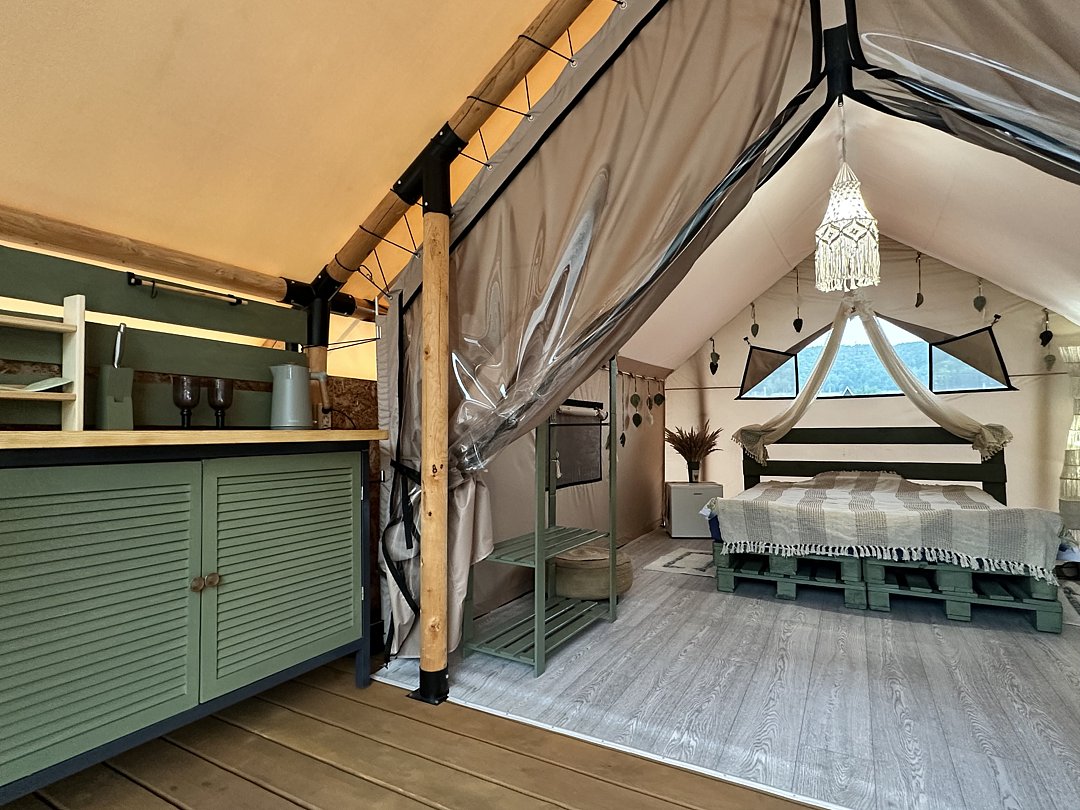 в сафари расположена двуспальная кровать, мини холодильник, шкаф, комод, торшер. на террасе обеденная зона и гамак, кухня с посудой и приборами.