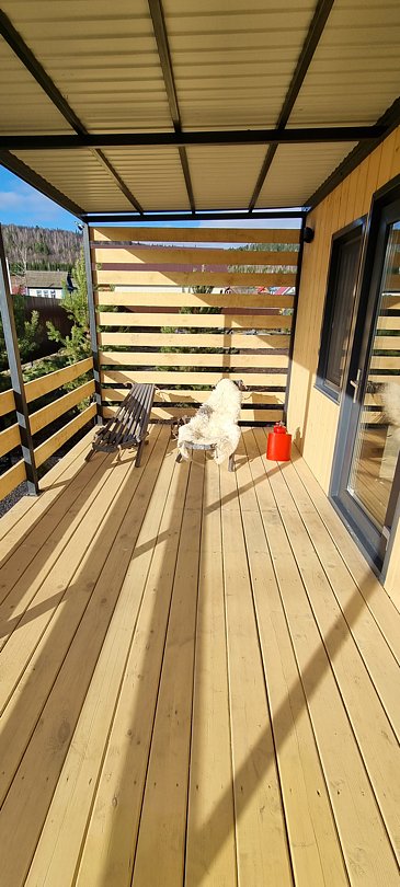 В доме есть кухня с плитой, холодильником, микроволновой печью, чайником и всей необходимой посудой; отдельная спальня с двуспальной кроватью, гостевая зона, обеденная зона, санузел с душем, терраса с уличной мебелью, собственная мангальная зона. Из спальни и гостиной открывается шикарный вид на реку и лес.