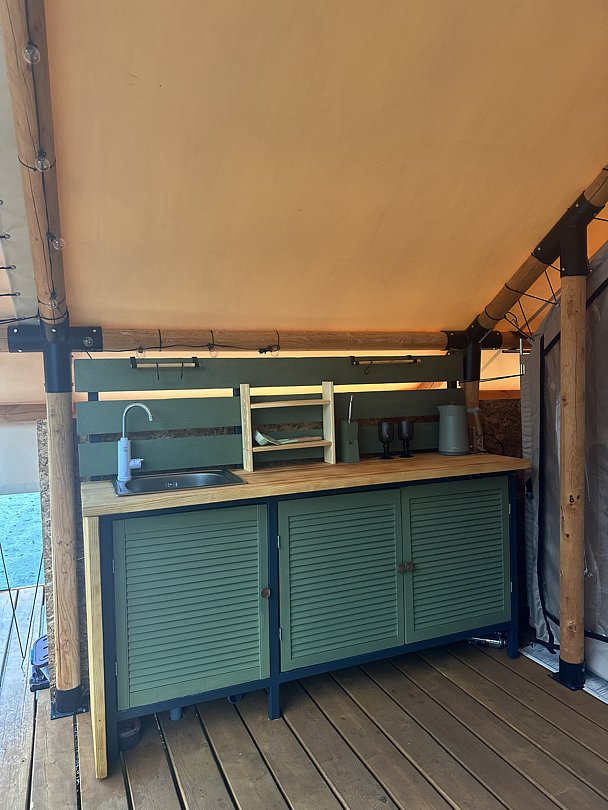 Душ и санузел расположены на территории ( примерно в 80 метрах), так как сафари тент находится над водой.