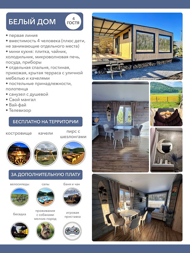 Вас ждут уютные дома с обстановкой и условиями, как в городской квартире, живописные места, катер, баня, чан, велосипеды, сап-борды, возможность рыбалки в любой сезон и многое другое для интересного и приятного отдыха на свежем воздухе! Зимой предоставляется бесплатный тюбинг.