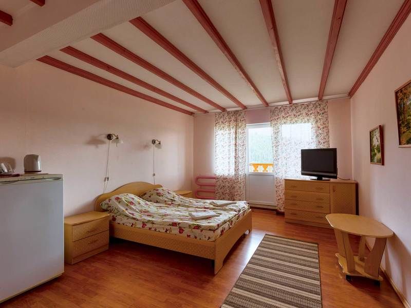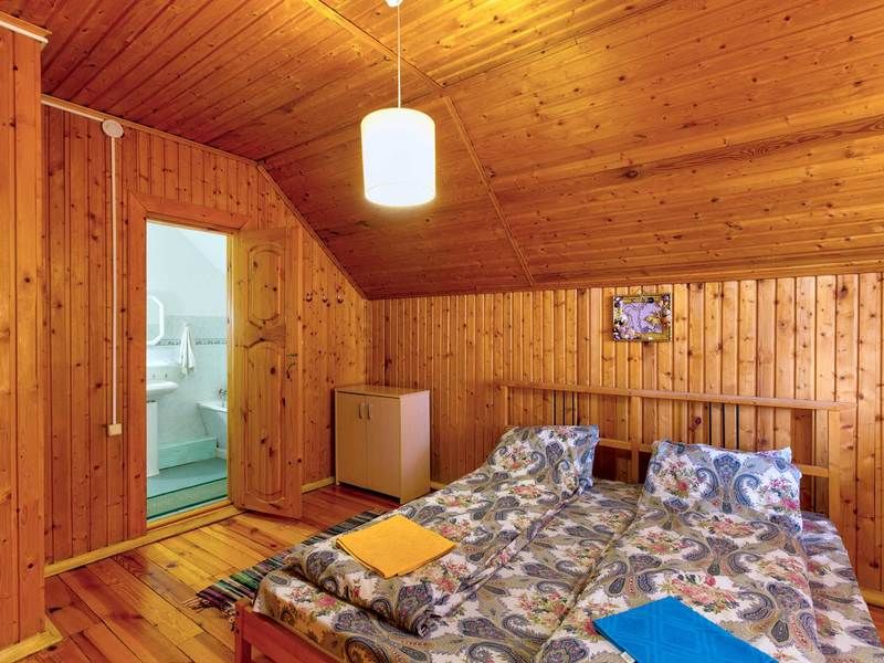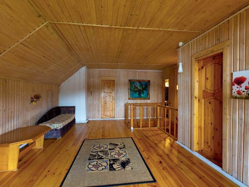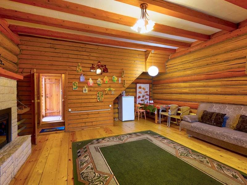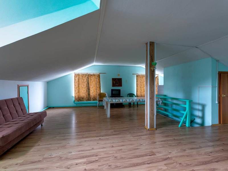 Просторный зал, 2-х комнатный номер (верхний этаж - спальня с раскладным диваном в мансарде), санузел в каждой комнате.