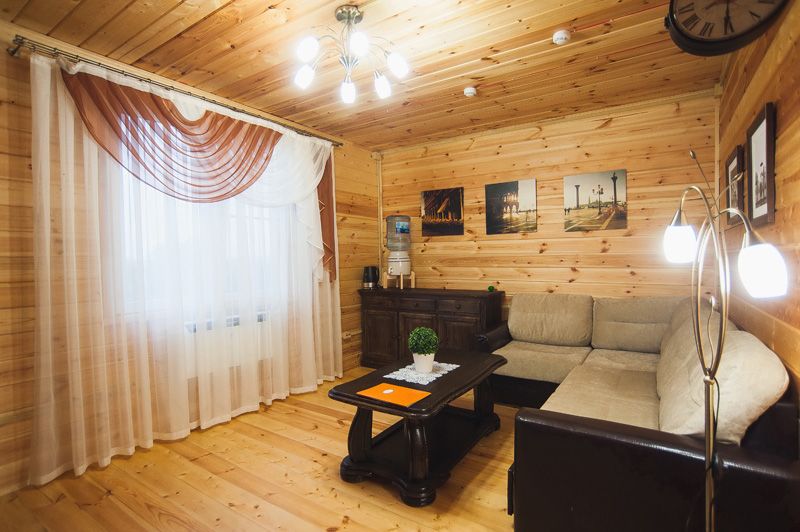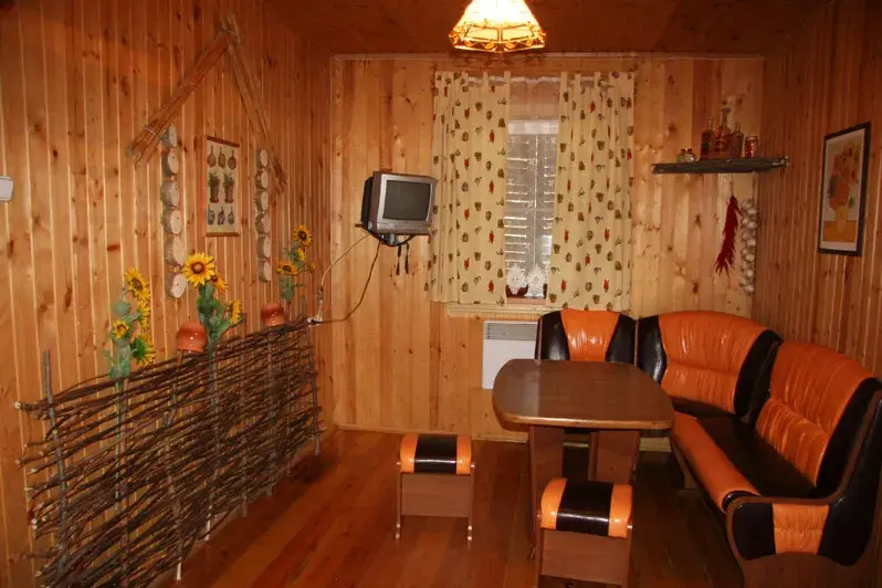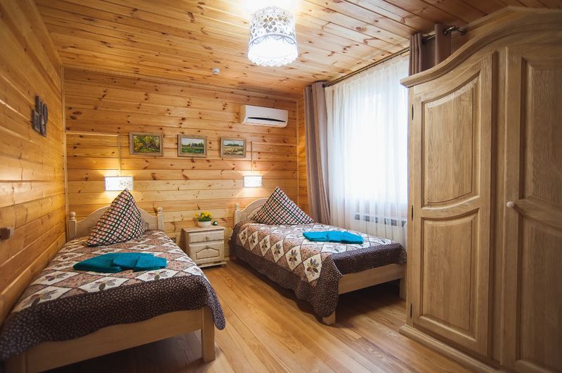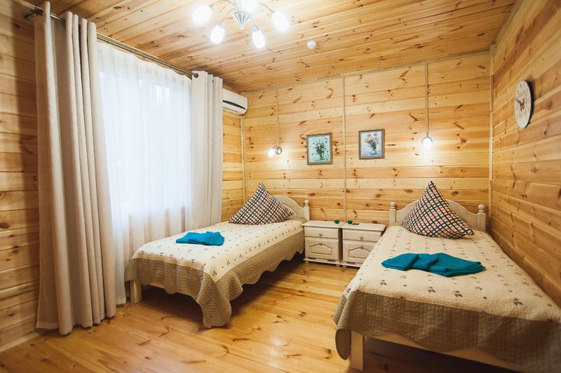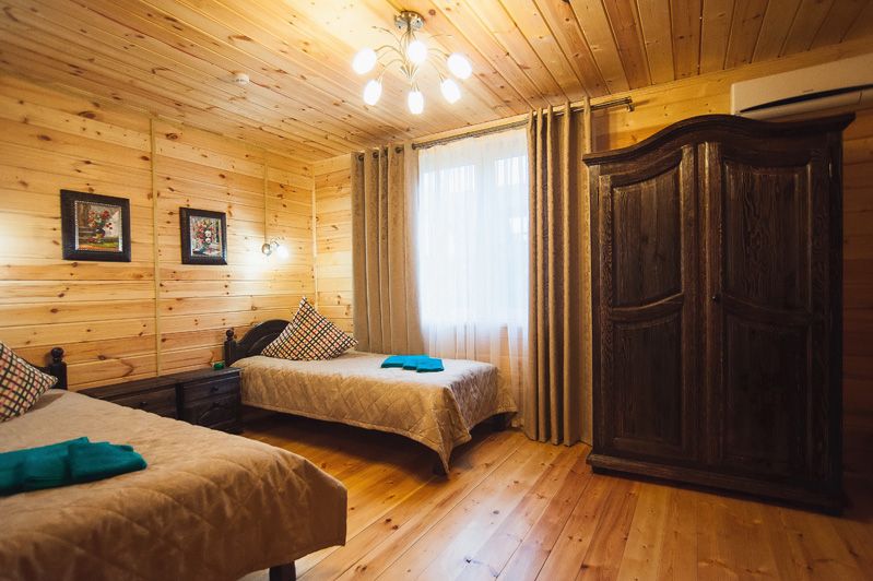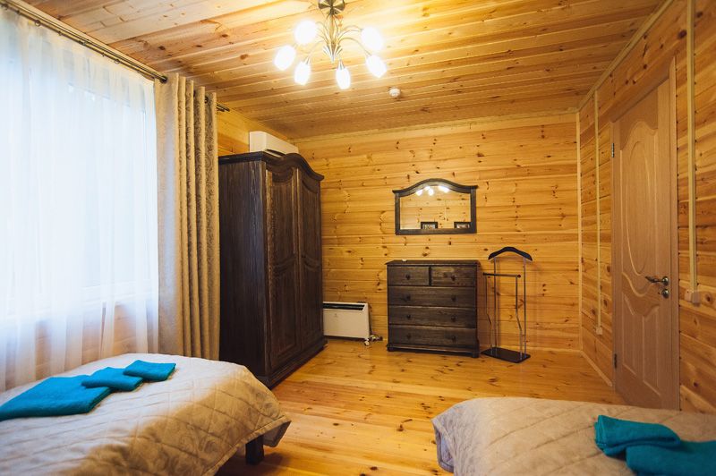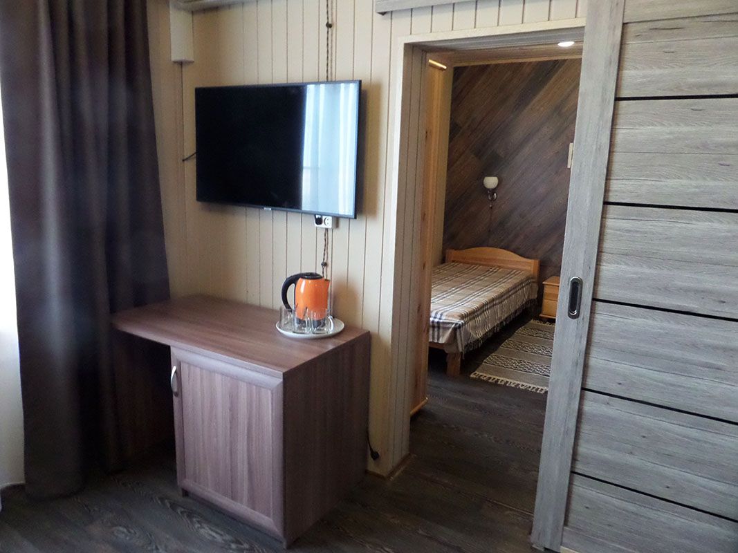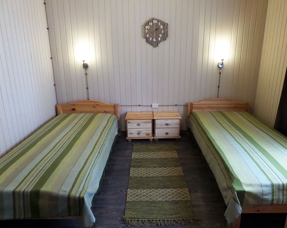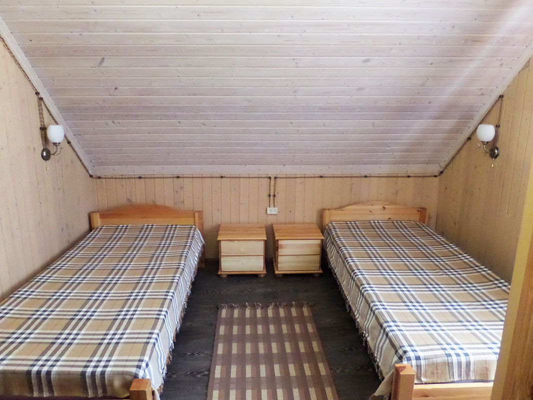 Трехэтажный коттедж. 1 этаж : столовая, бильярд, сауна, душевая, санузел и технические помещения. Проживание на 3 этаже - один 2х-комнатный номер (2 одинаковые комнаты), общая гостиная с ТВ и чайным столом, 1 санузел, маленький холодильник в каждом номере.