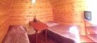 Двухэтажный домик, на первом этаже терраса, обеденная зона, кухня, санузел. На втором этаже спальня: три 1,5-спальные кровати.