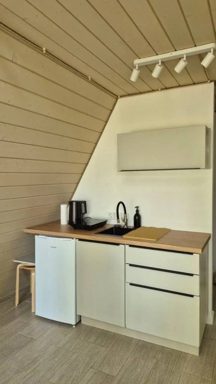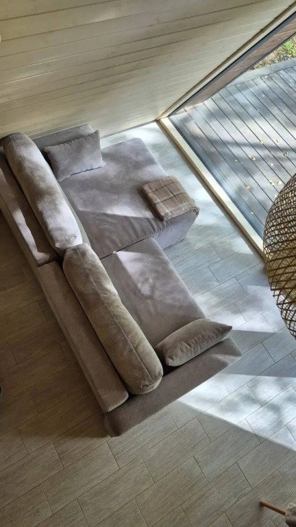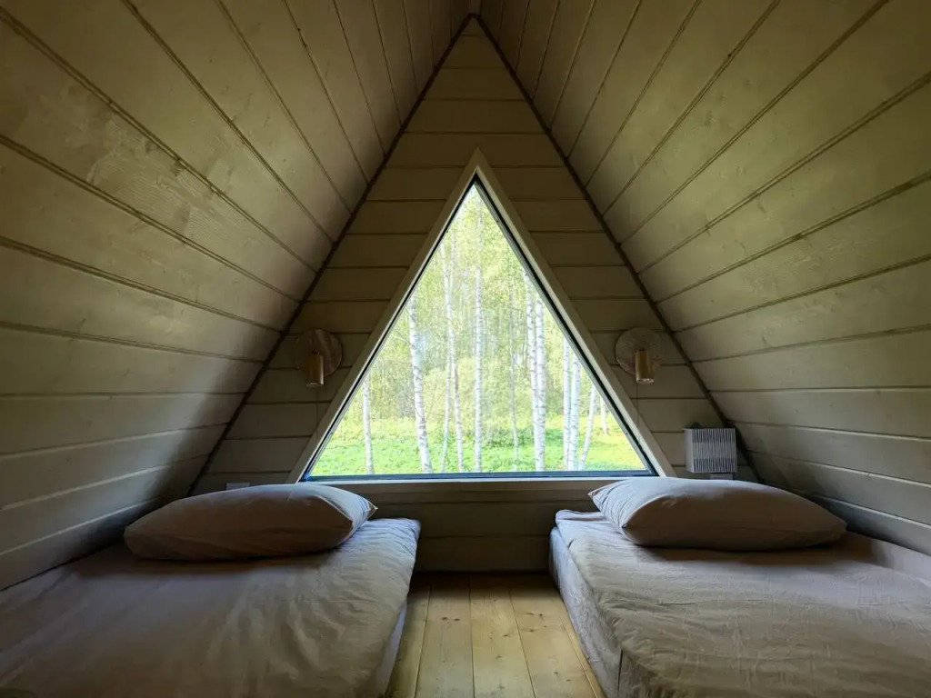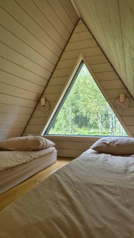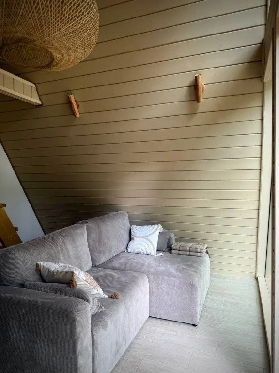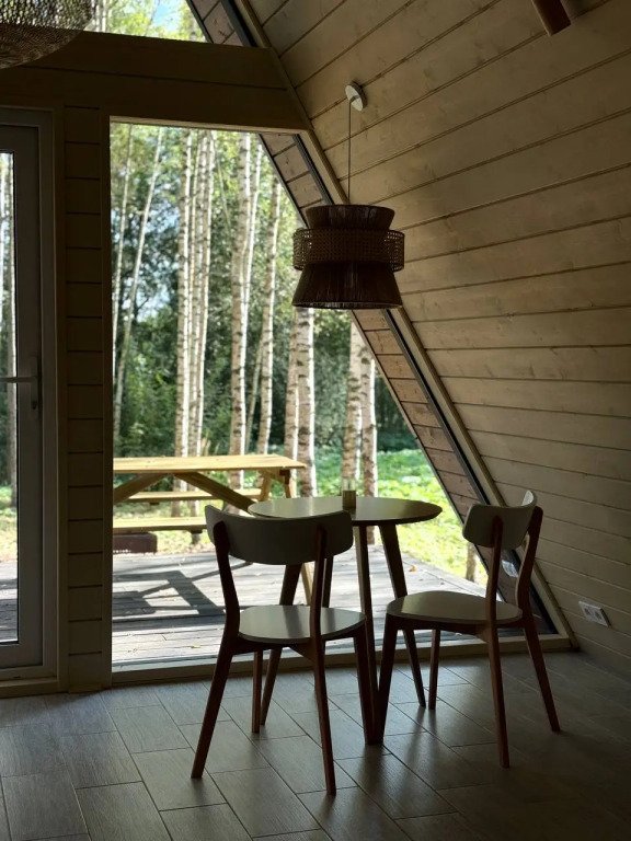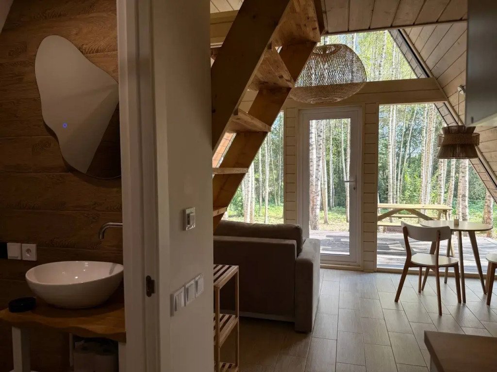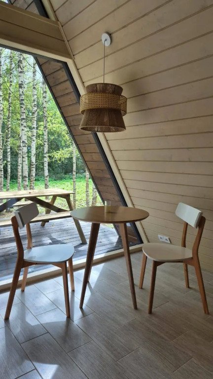 1 этаж: гостиная с диваном-кроватью 140×200 см, кухня, санузел; 2 этаж: спальная зона на двух матрасах 90×200 см. Большая терраса с мангальной зоной, Wi-Fi.