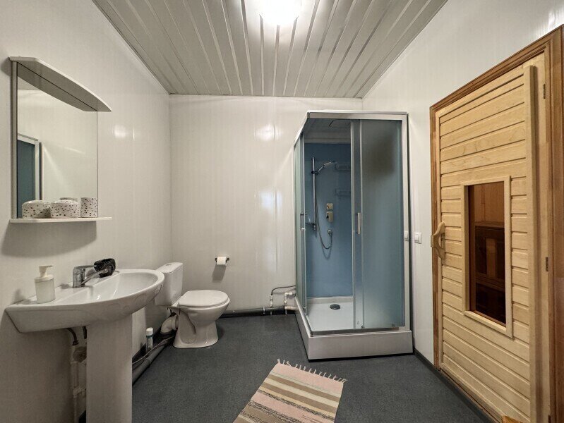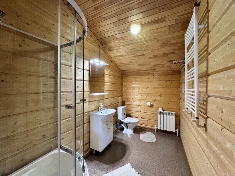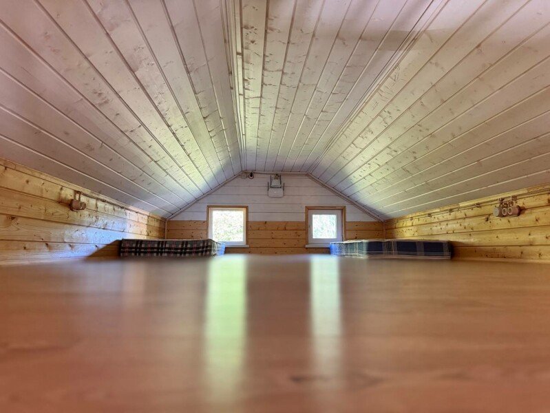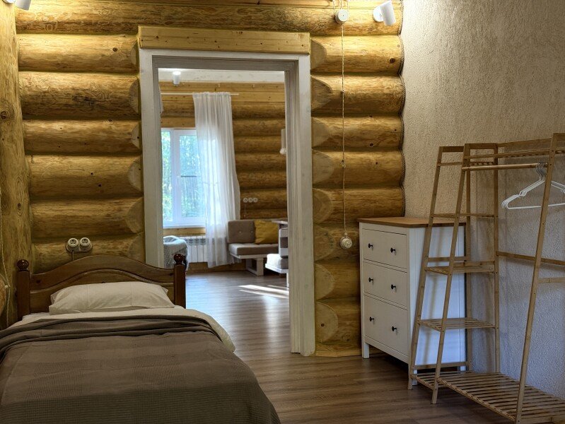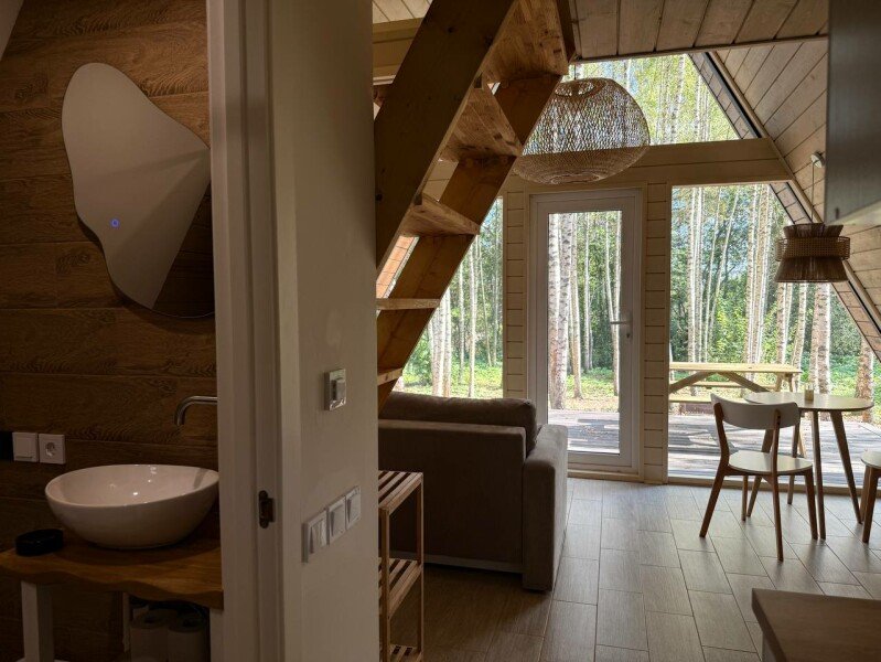 Двухкомнатный дом с мансардой 150 м² на семь человек. Мангальная зона у крыльца. Просторная гостиная с полностью оборудованной кухней, посудомоечная машина, духовка, ТВ и Wi-Fi. Ванная комната с душем, туалетом и раковиной. На втором этаже два матраца, на котором могут разместиться как дети, так и взрослые.