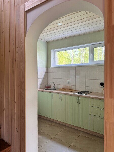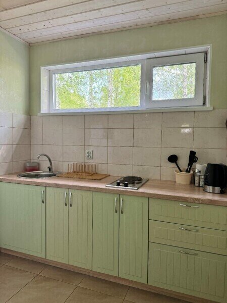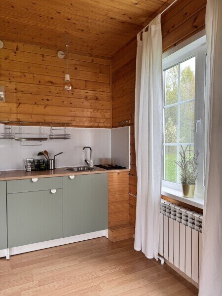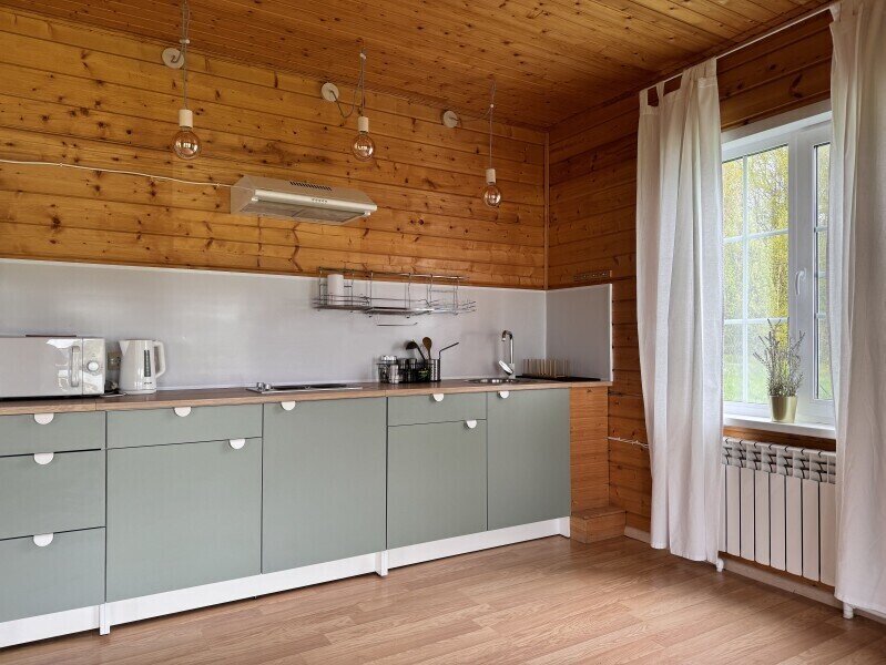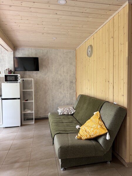 Дом площадью 72 м² вмещает четыре человека. Мангальная зона расположена у крыльца. Гостиная с полностью оборудованной кухней, телевизор, Wi-Fi и раскладной диван шириной сто двадцать сантиметров.