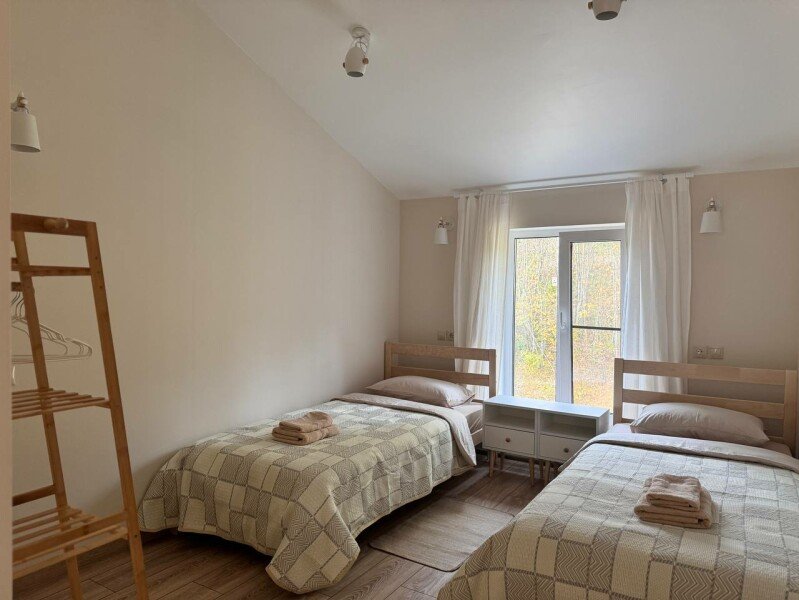 На втором этаже зал-чайная и 4 номера с собственным санузлом, в каждом номере по две односпальные кровати.