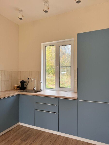 Дом 72 м2 на 4 человек. Мангальная зона у крыльца. Гостиная с полностью оборудованной кухней, ТВ и Wi-Fi и раскладным диваном (ширина 120). Ванная комната с душем, туалетом и раковиной. На втором этаже одна двуспальная кровать 160см и одна односпальная 90см.