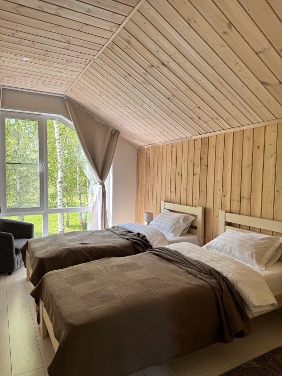 2-й этаж: 2 спальни (двуспальная кровать 160 см + односпальная 90×200 см; 2 односпальные кровати 90×200 см).
